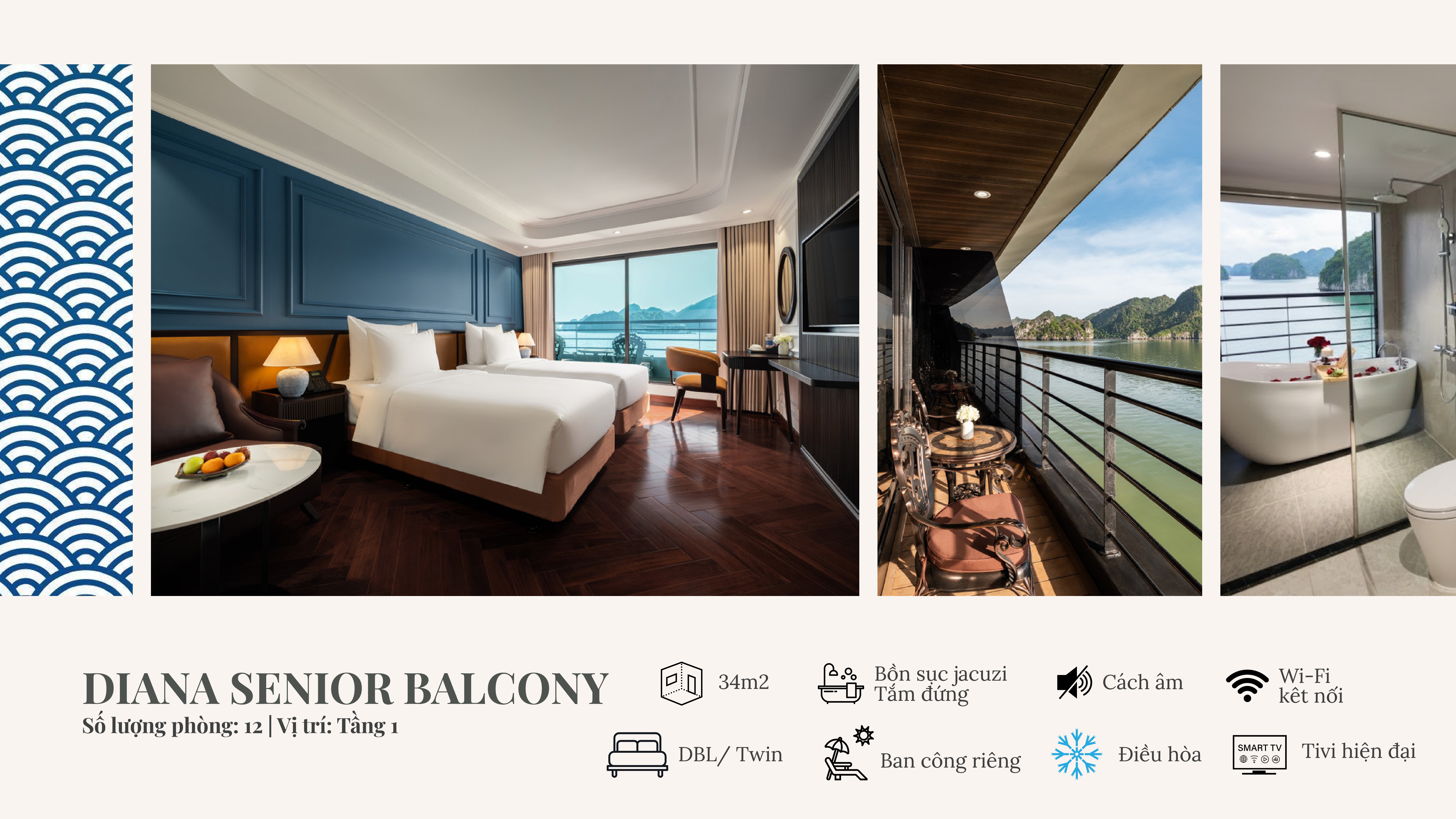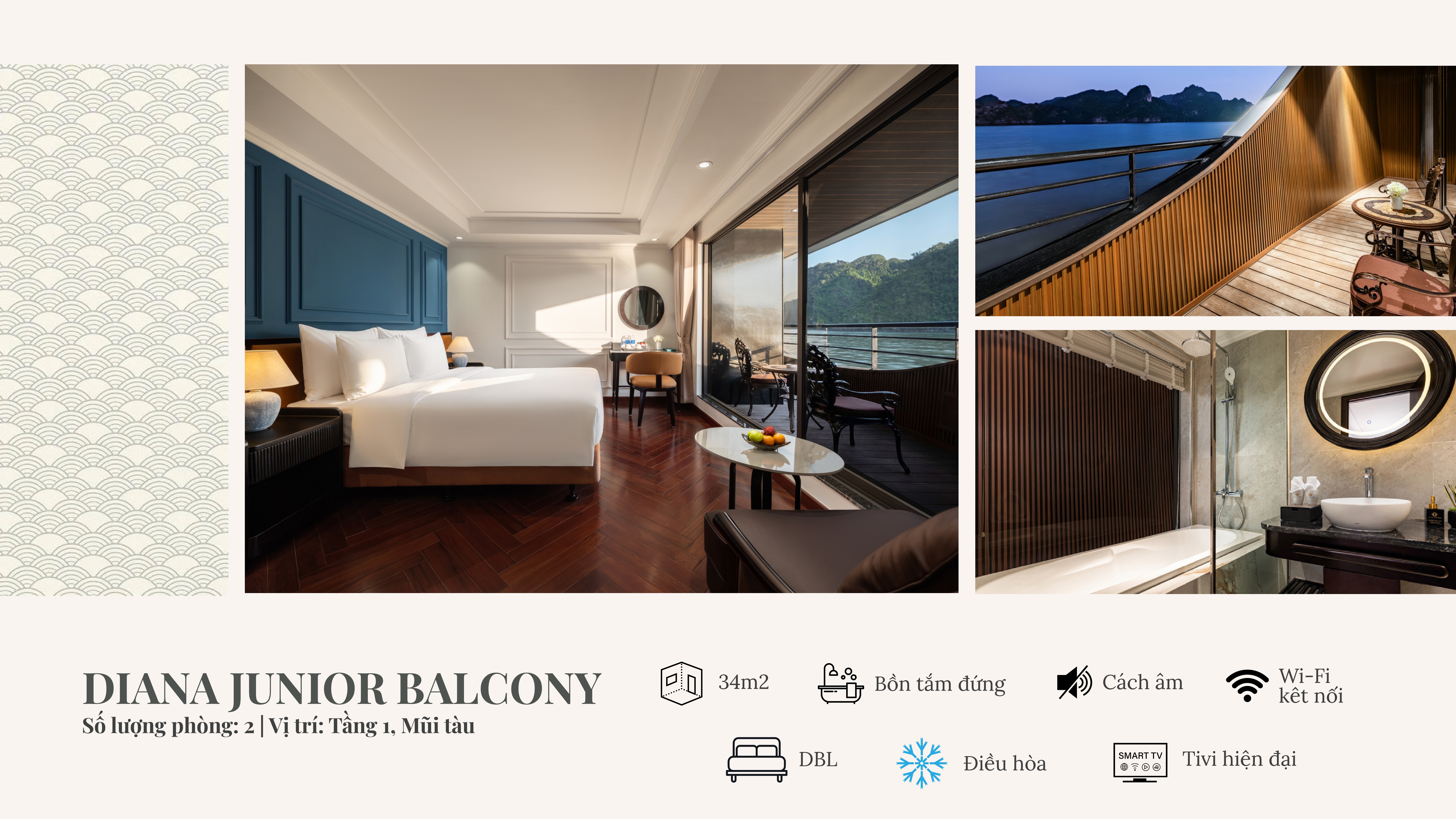 Đây là hạng phòng tiêu chuẩn của Du thuyền Diana Cruise với mức giá tốt nhất. Gồm có 2 cabin nằm tại mũi tàu tầng 1, được trang bị đầy đủ tiện nghi hiện đại, ban công riêng và bồn tắm hướng vịnh, mang đến không gian nghỉ ngơi thoải mái và riêng tư.