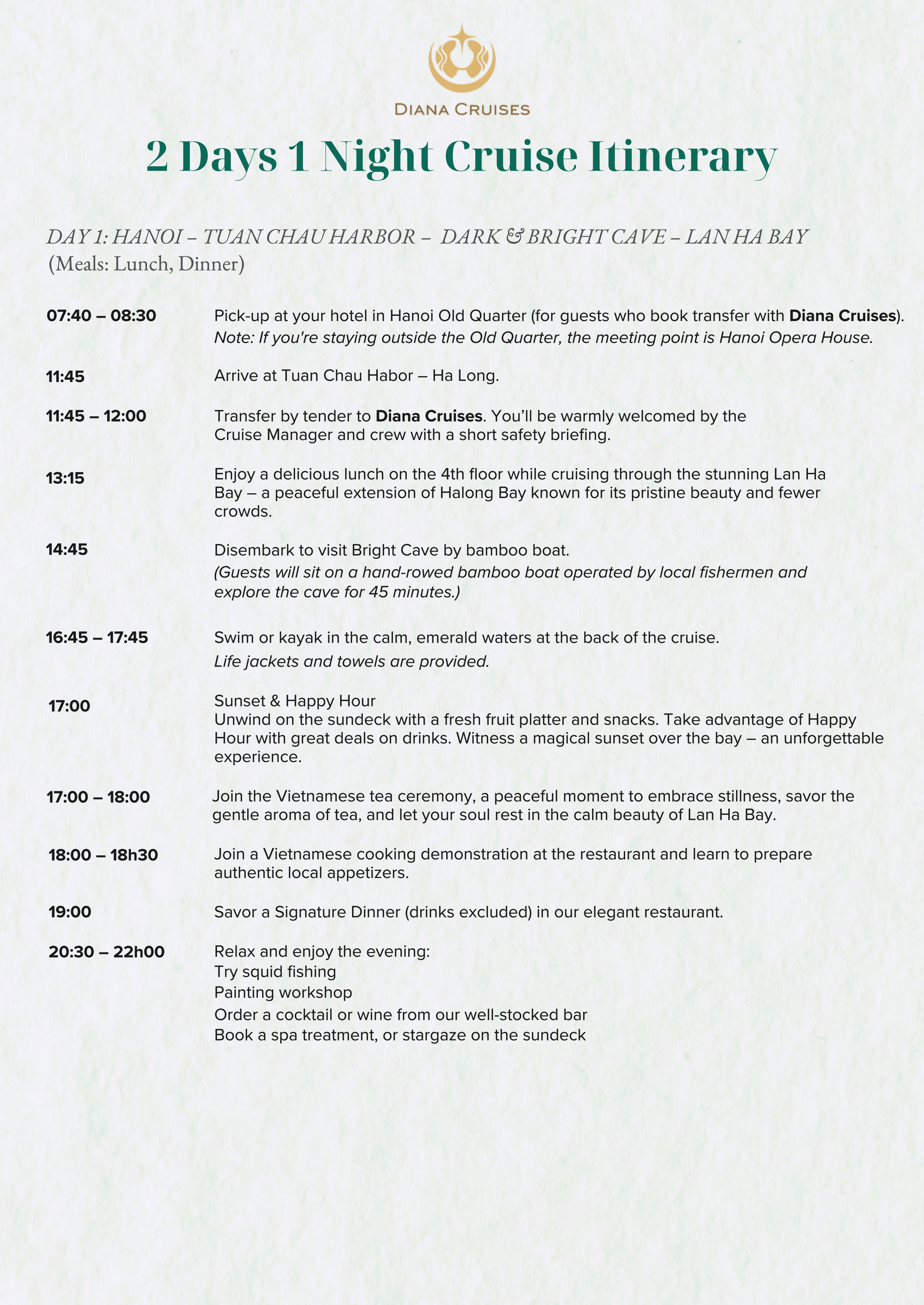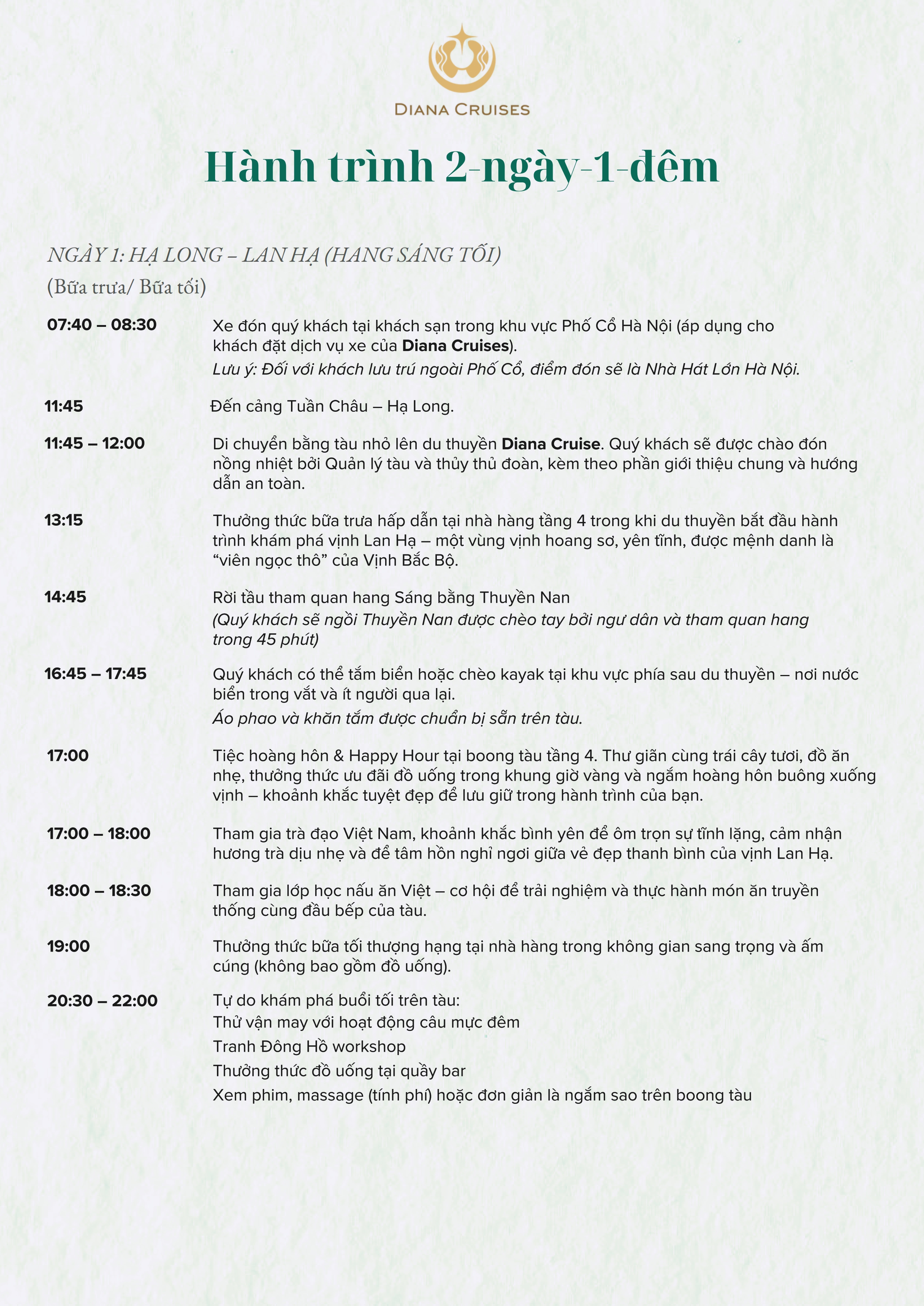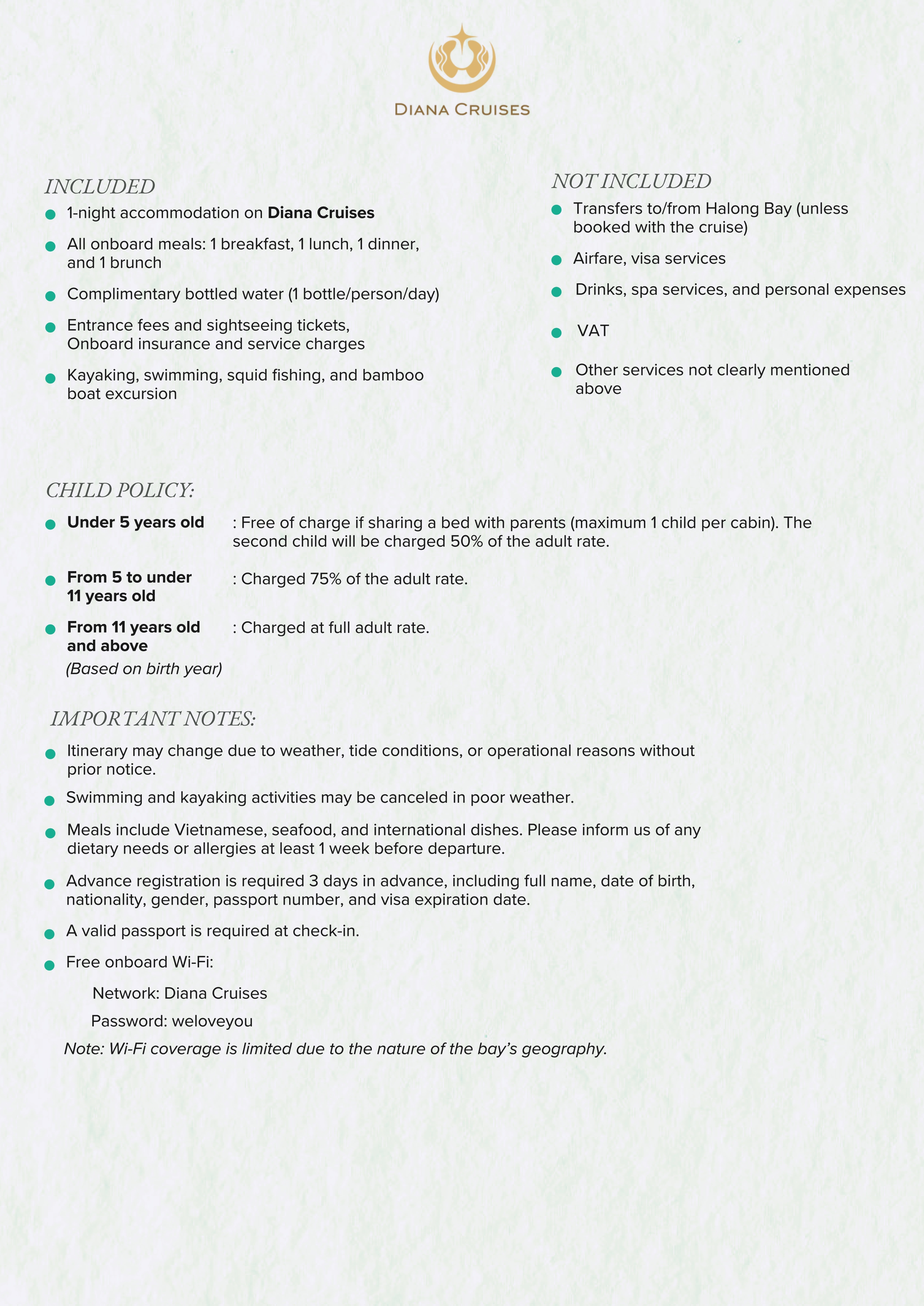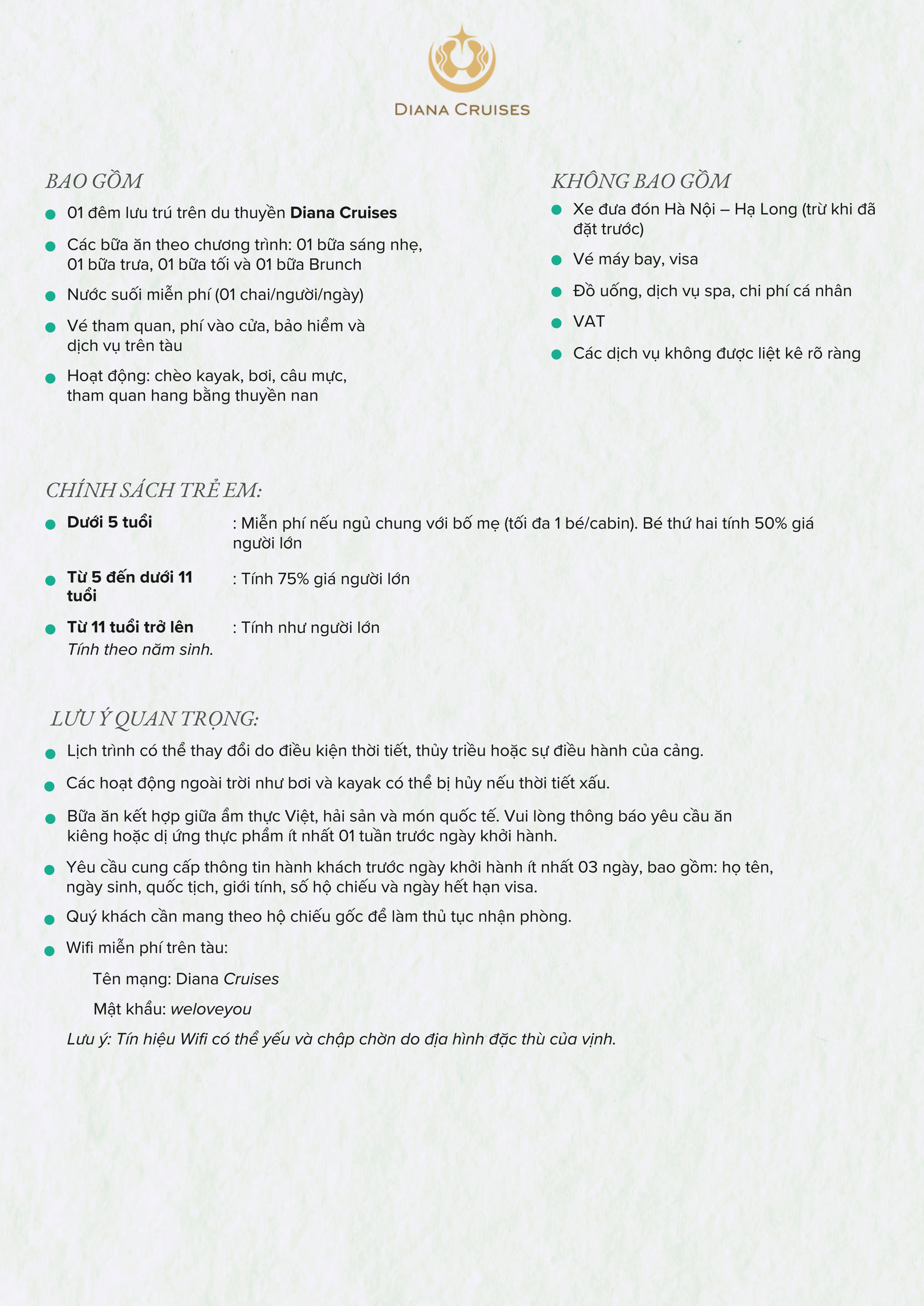 - 01 đêm lưu trú trên du thuyền Diana Cruises