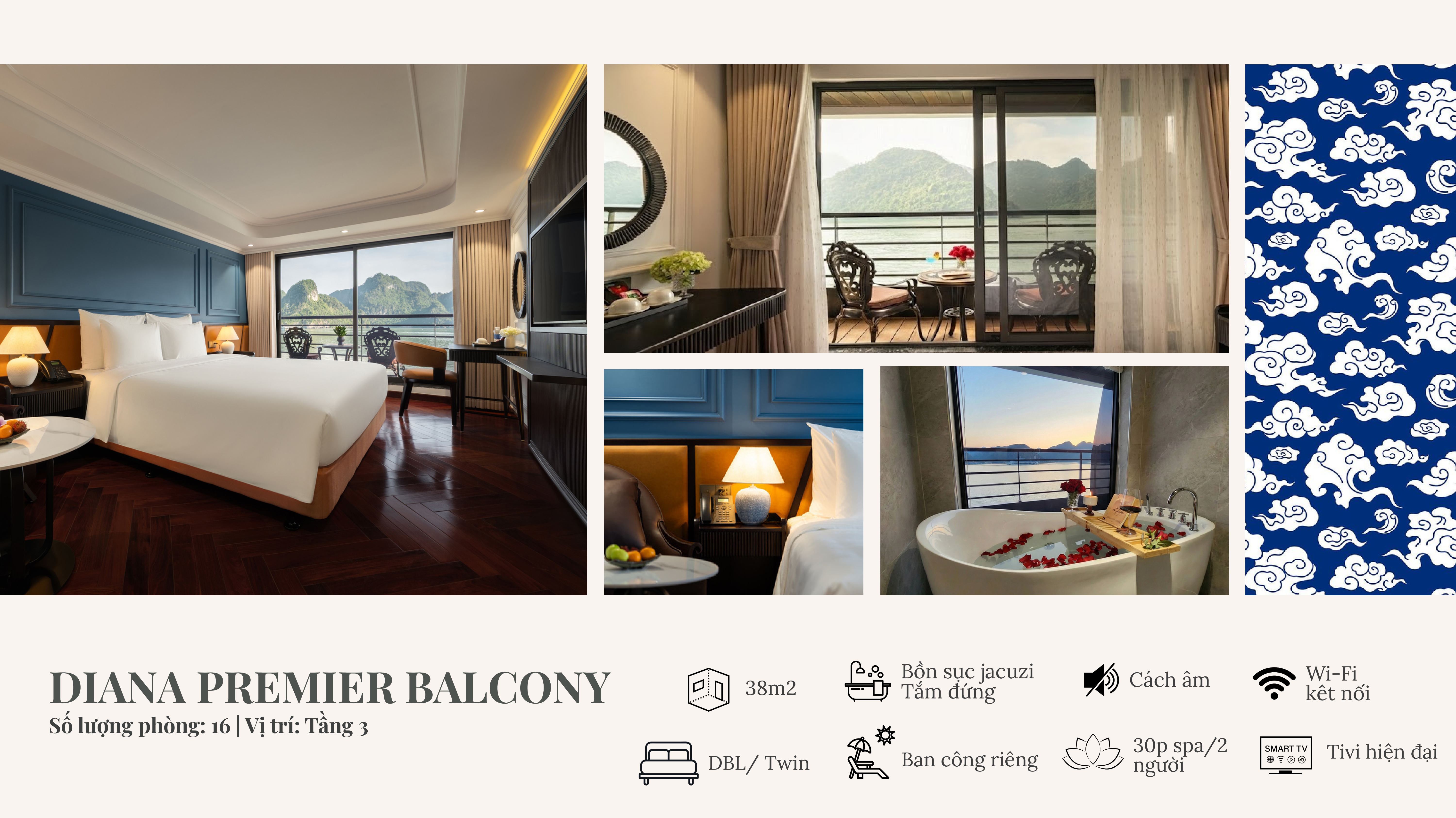 Premier Balcony là phiên bản nâng cấp của Executive, với diện tích lớn hơn và vị trí view đẹp hơn, mang đến trải nghiệm nghỉ dưỡng cao cấp và trọn vẹn hơn trên Du thuyền Diana Cruise.
