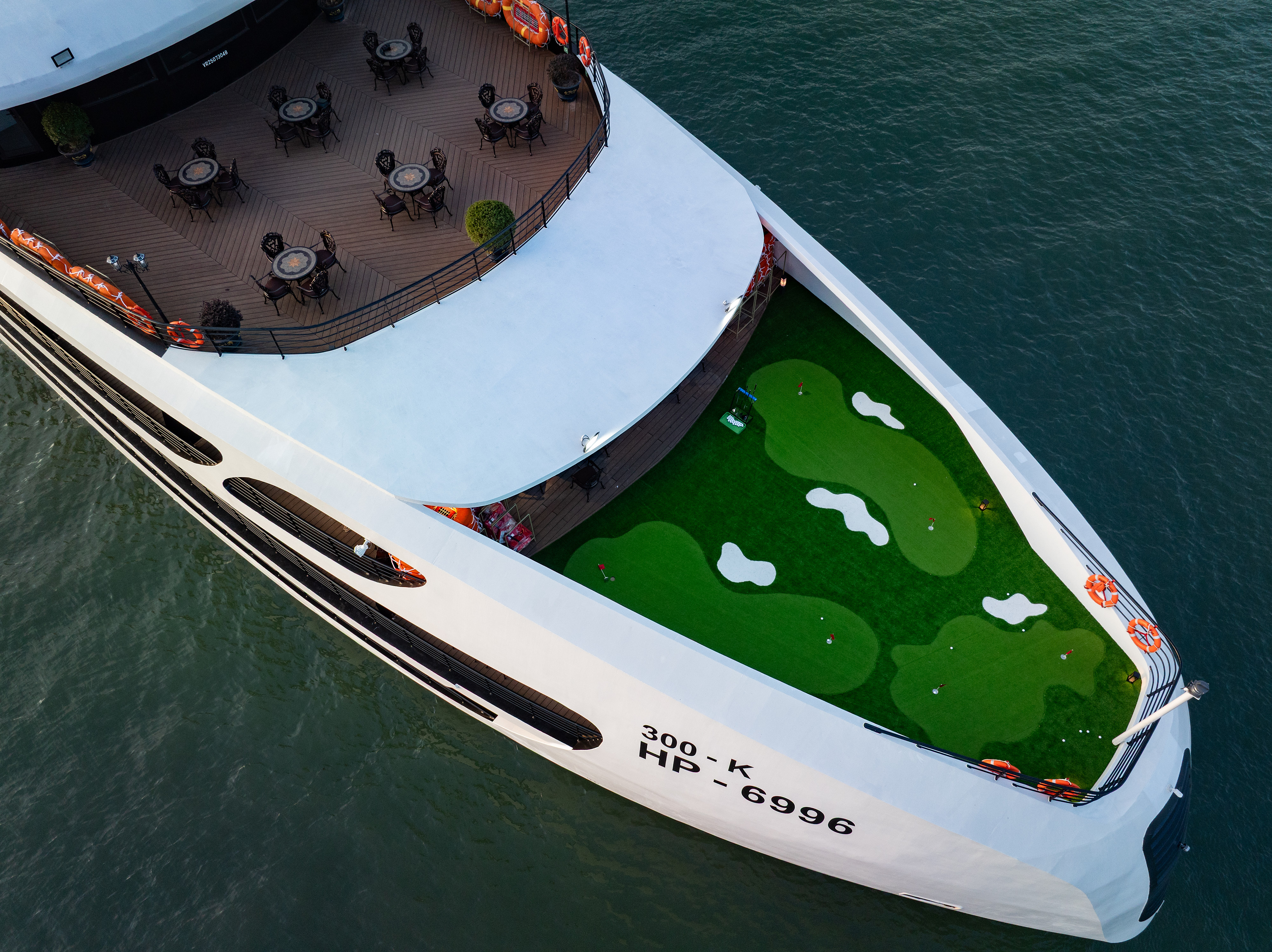 Mini Golf tại mũi tàu tầng 2, mang đến không gian vận động nhẹ nhàng và thư giãn giữa biển trời. Du khách còn được trải nghiệm công nghệ Golf 3D thực tế ảo, tạo nên điểm nhấn giải trí độc đáo hiếm có trên du thuyền.