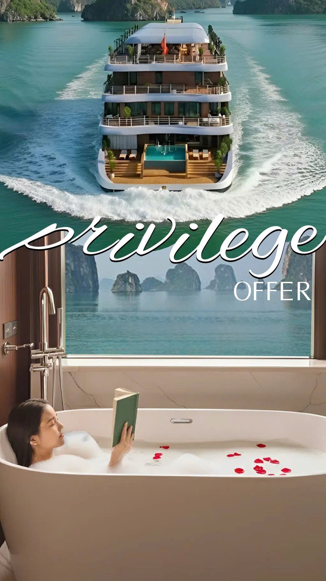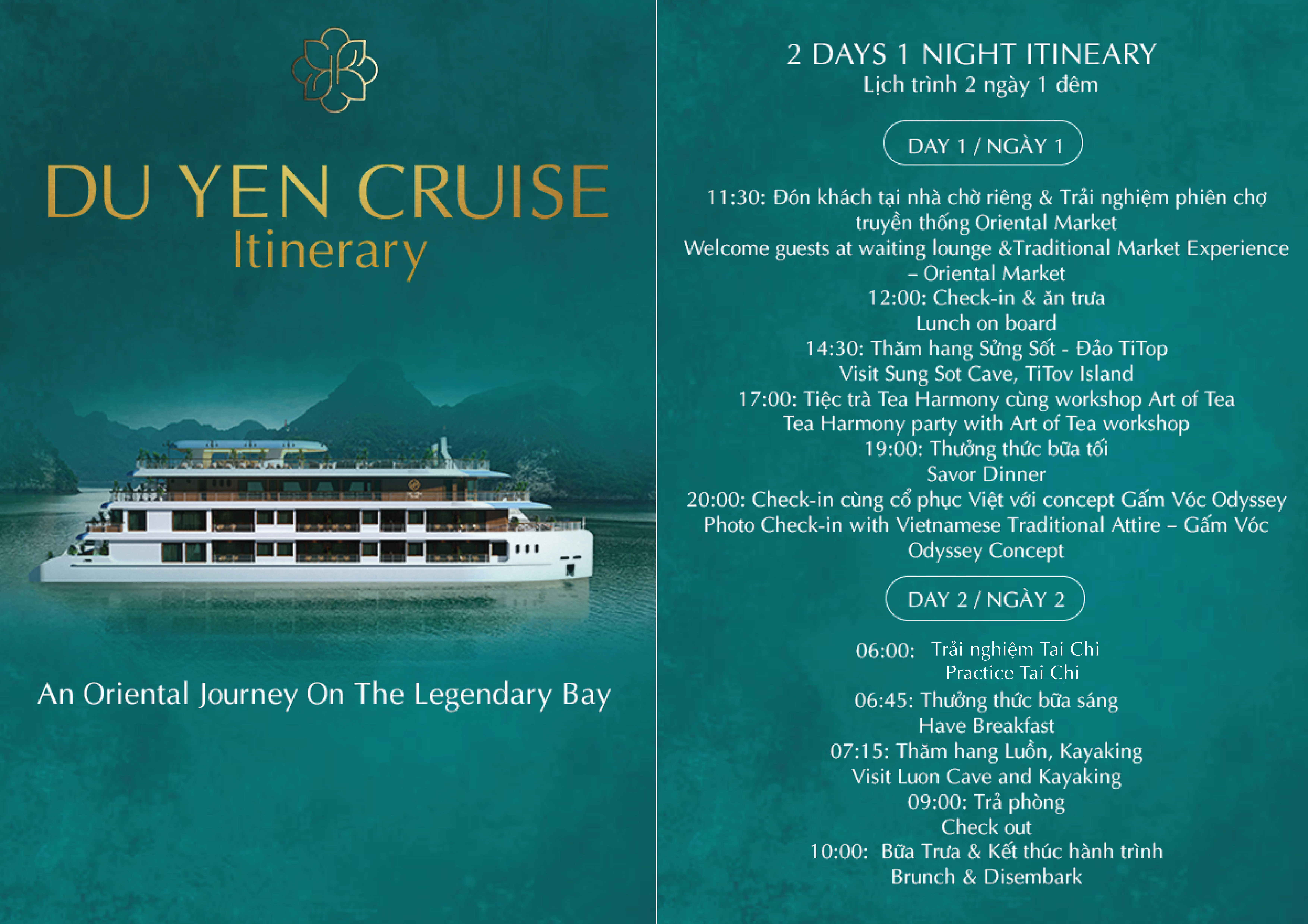 Hành trình của du thuyền Du Yên mang chủ đề “Hành Trình Phương Đông”, đưa du khách qua những vịnh biển thơ mộng, những đảo đá vôi hùng vĩ và những làng chài truyền thống. Không chỉ là một chuyến tham quan, đây còn là một hành trình đắm chìm vào văn hóa, ẩm thực tinh tế, các hoạt động truyền thống và lòng hiếu khách đẳng cấp thế giới ngay tại trung tâm của di sản Thế giới được UNESCO công nhận.