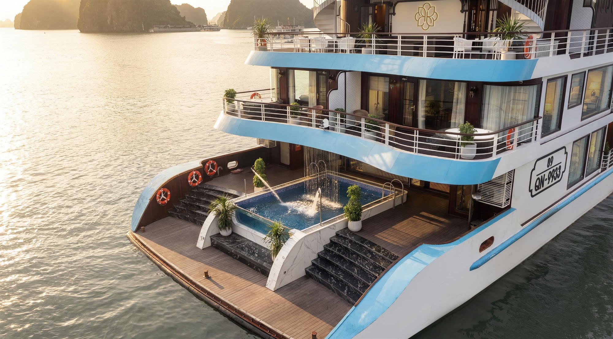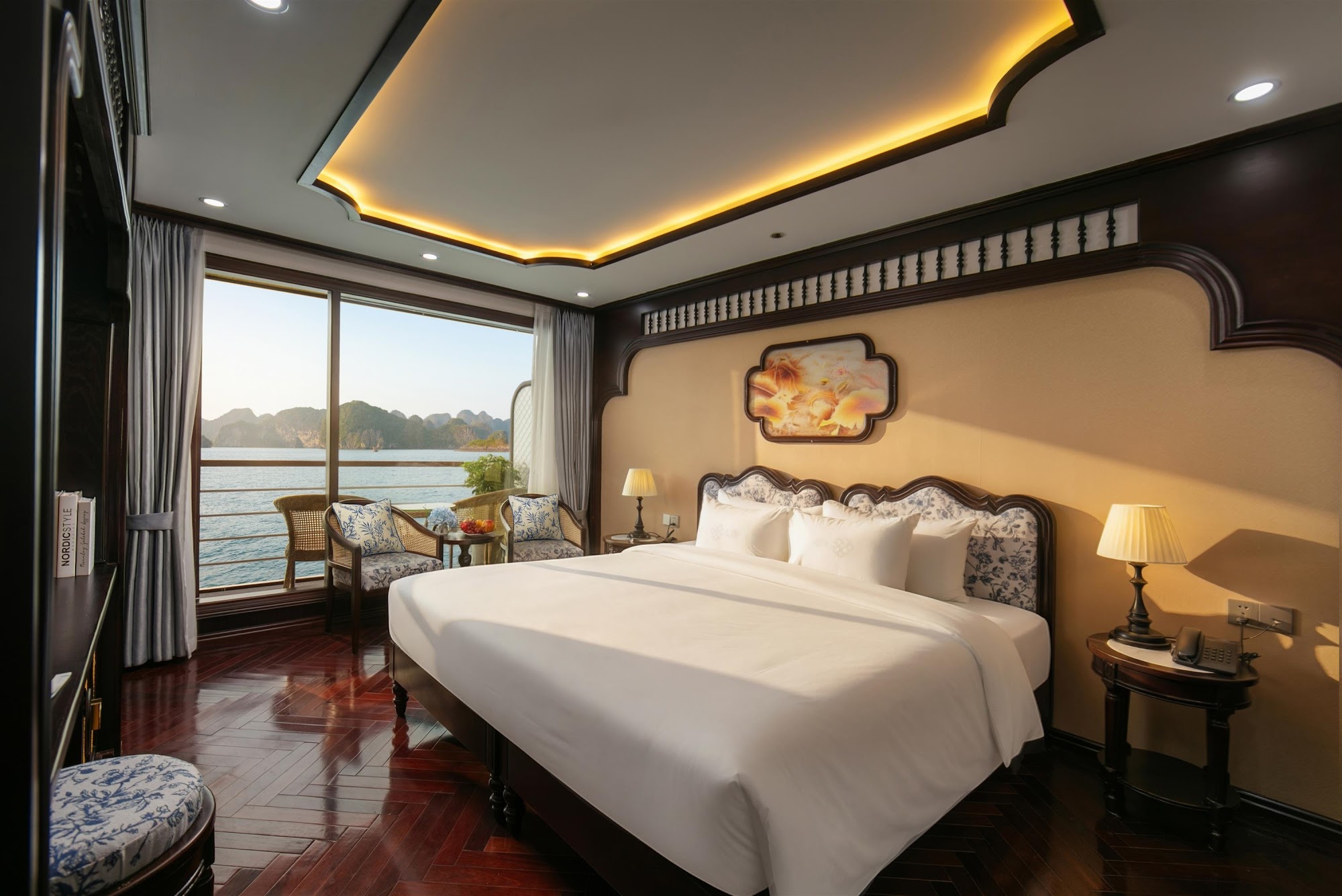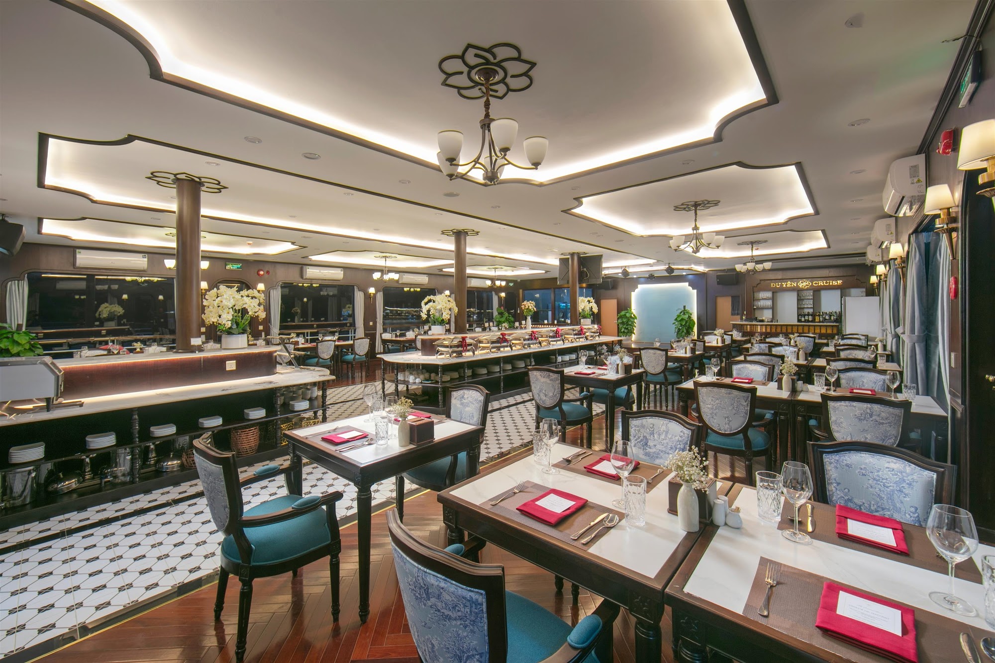 Điểm nhấn của du thuyền Du Yên nằm ở thiết kế tân cổ điển Châu Âu kết hợp tinh tế phương Đông – sự giao thoa hài hòa giữa nét thanh lịch Châu Âu và cảm hứng Á Đông. Từng chi tiết đều được chế tác tỉ mỉ, mang đến một không gian vừa tinh tế vừa lôi cuốn, vừa tinh tế vừa tràn đầy cảm xúc.