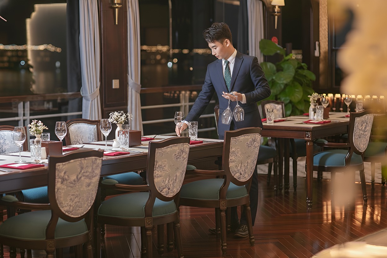 Ẩm thực là yếu tố then chốt làm nên sức hút của Du Yên Cruise Hạ Long. Nhà hàng trên du thuyền thiết kế mở, tràn ngập ánh sáng tự nhiên, phục vụ các bữa ăn fine-dining kết hợp ẩm thực Á – Âu. Từ hải sản tươi ngon của vịnh đến các món truyền thống Việt Nam, mỗi bữa ăn đều là nghệ thuật trình bày và hương vị.