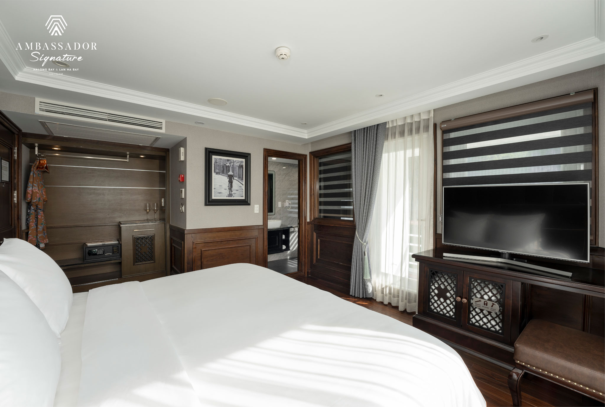 Kích thước thuộc dạng “khủng” với chiều dài 69,98m, chiều rộng 13,5m và chiều cao 13m cùng 39 cabin phòng nghỉ hạng sang với sức chứa lên tới 120 khách, du thuyền Ambassador Signature được xem như một khách sạn nổi 5* di động trên vịnh Lan Hạ.