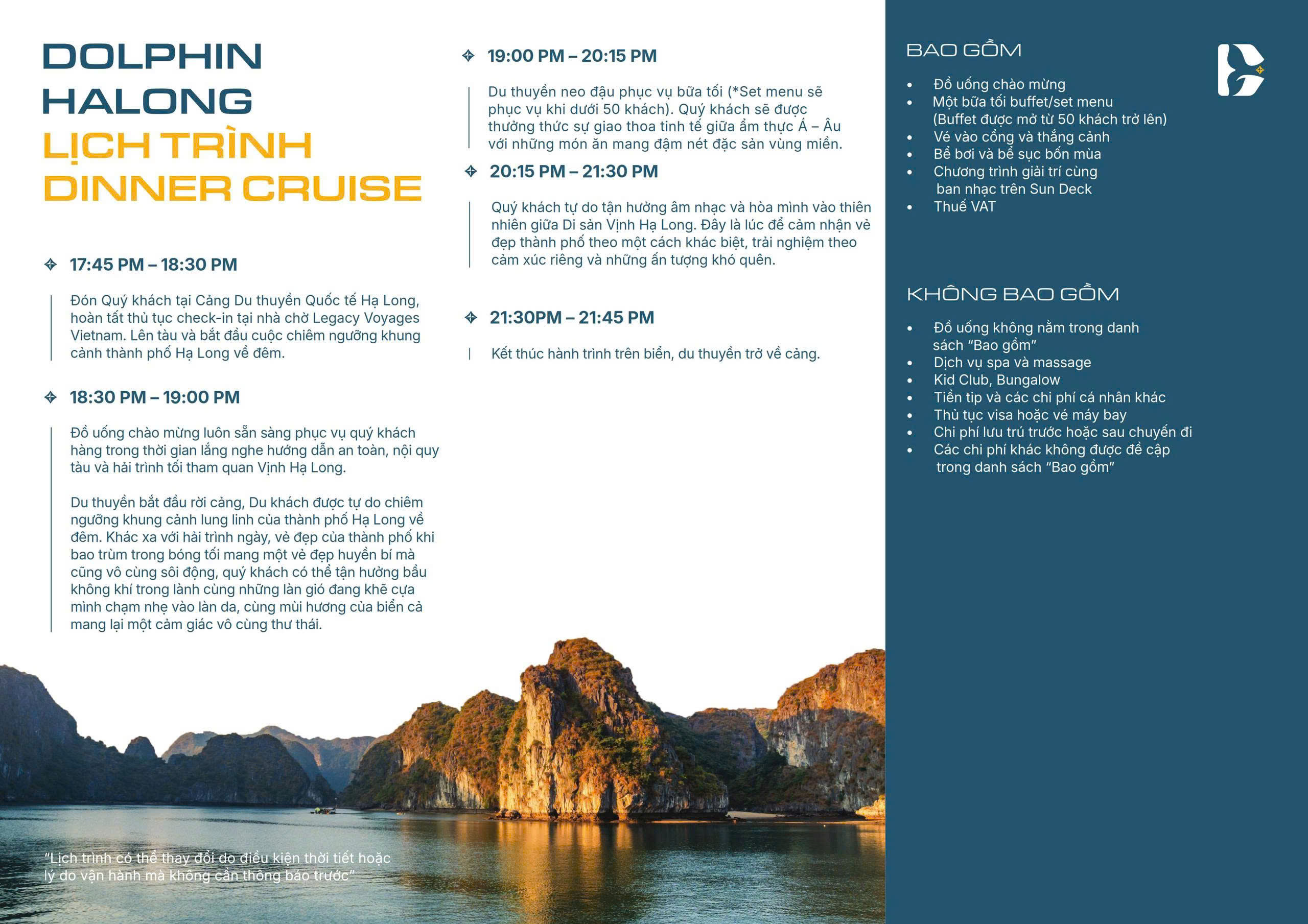 Bởi với Dolphin, chuẩn mực dịch vụ đích thực được đo bằng cảm xúc đọng lại, khi quý khách hoàn toàn an tâm tận hưởng từng phút giây trên hải trình cùng Dolphin Halong Cruise.