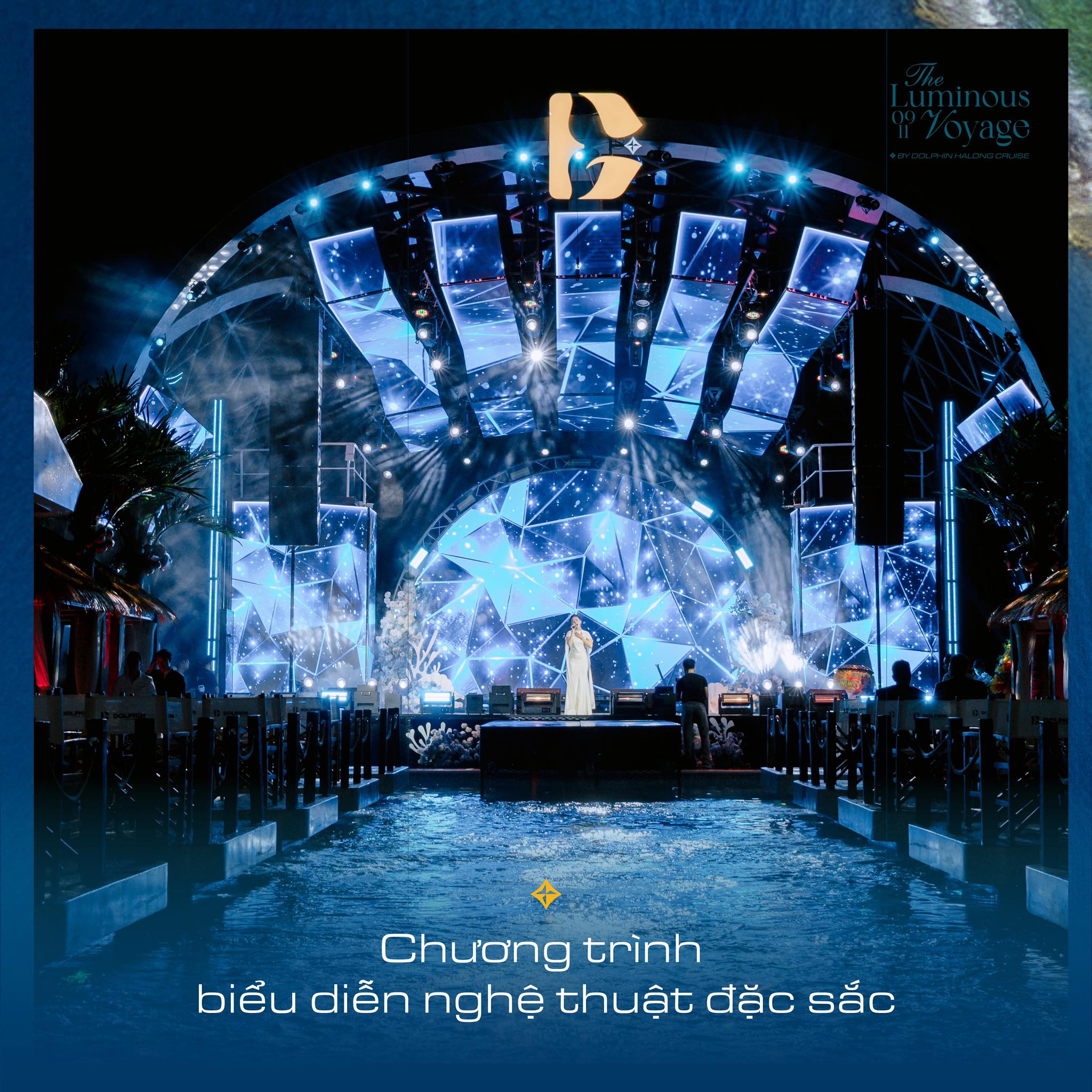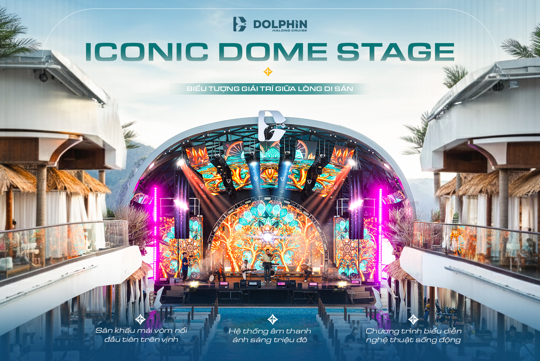 Là sân khấu mái vòm đầu tiên và duy nhất trên vịnh di sản, Dome Stage được ví như trái tim của Dolphin Halong Cruise – nơi nghệ thuật trình diễn ánh sáng, âm nhạc và cảm xúc hòa quyện, kiến tạo nên trải nghiệm giải trí đỉnh cao giữa vịnh Hạ Long.