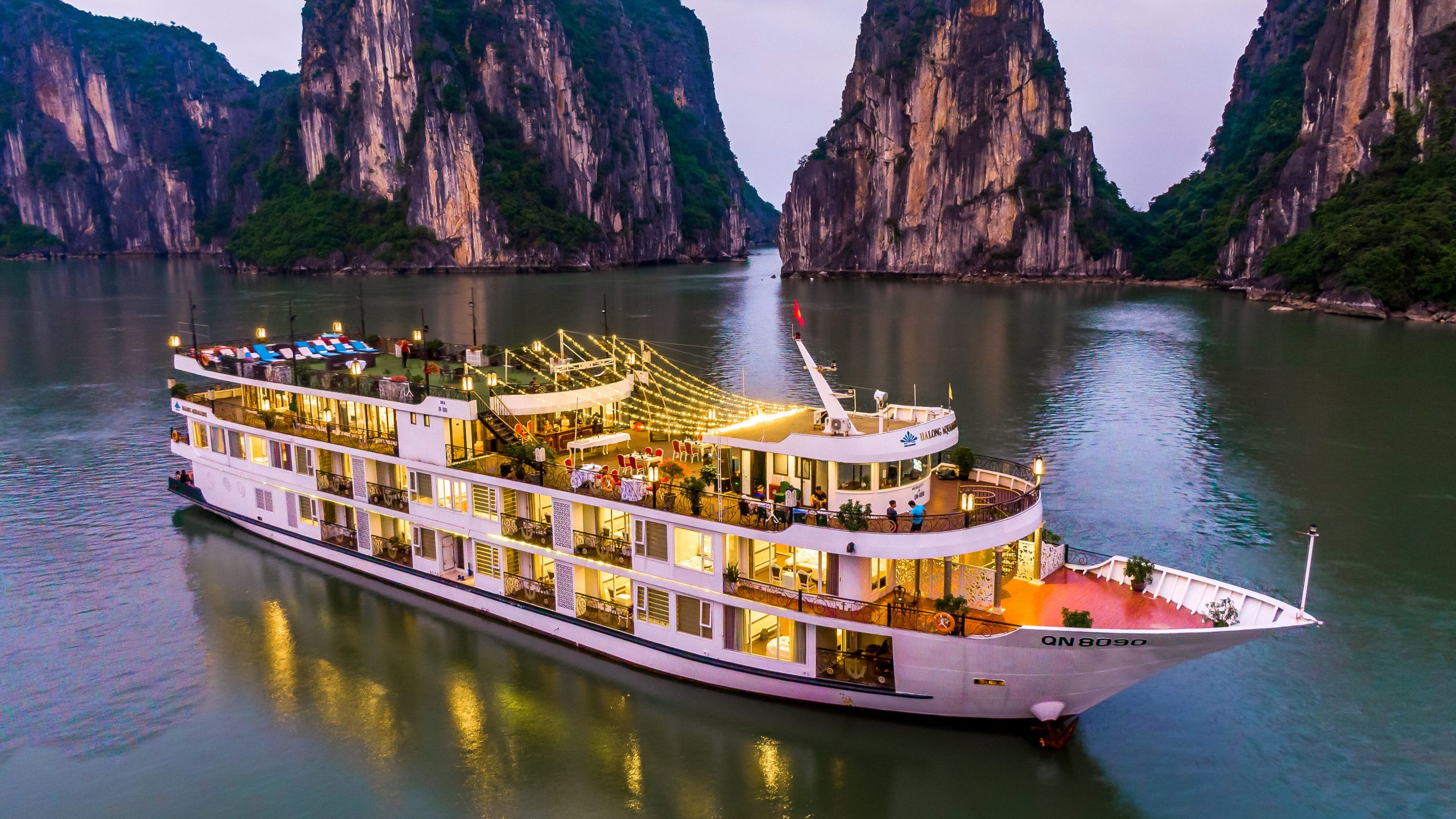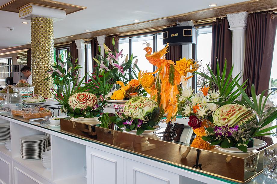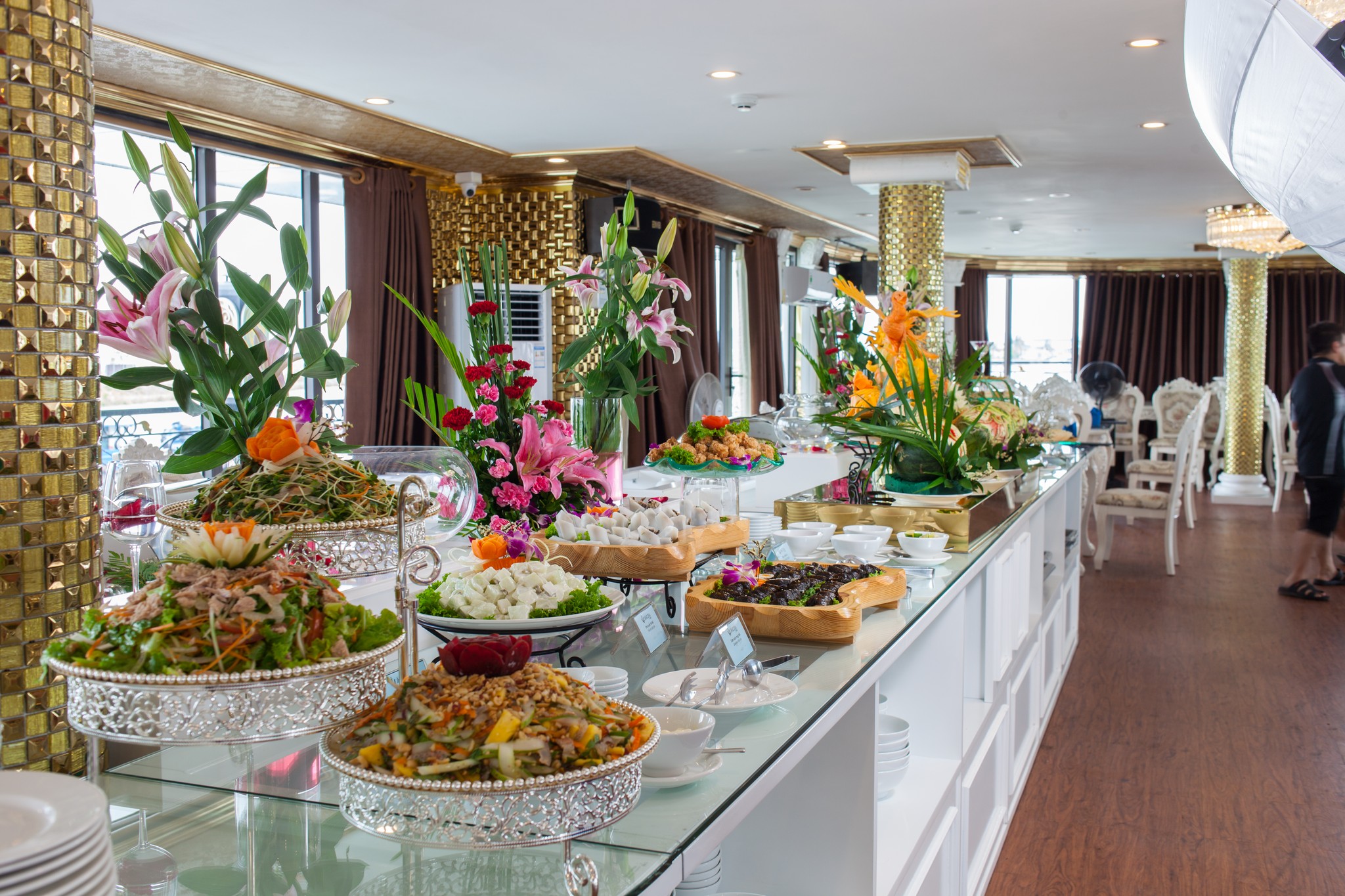 – Các bữa ăn trên tàu gồm các món ăn Việt Nam, hải sản và các món quốc tế. Du khách có những yêu cầu đặc biệt về thực đơn, dị ứng thực phẩm hay chế độ ăn riêng xin vui lòng thông báo ít nhất 01 tuần trước chuyến đi.