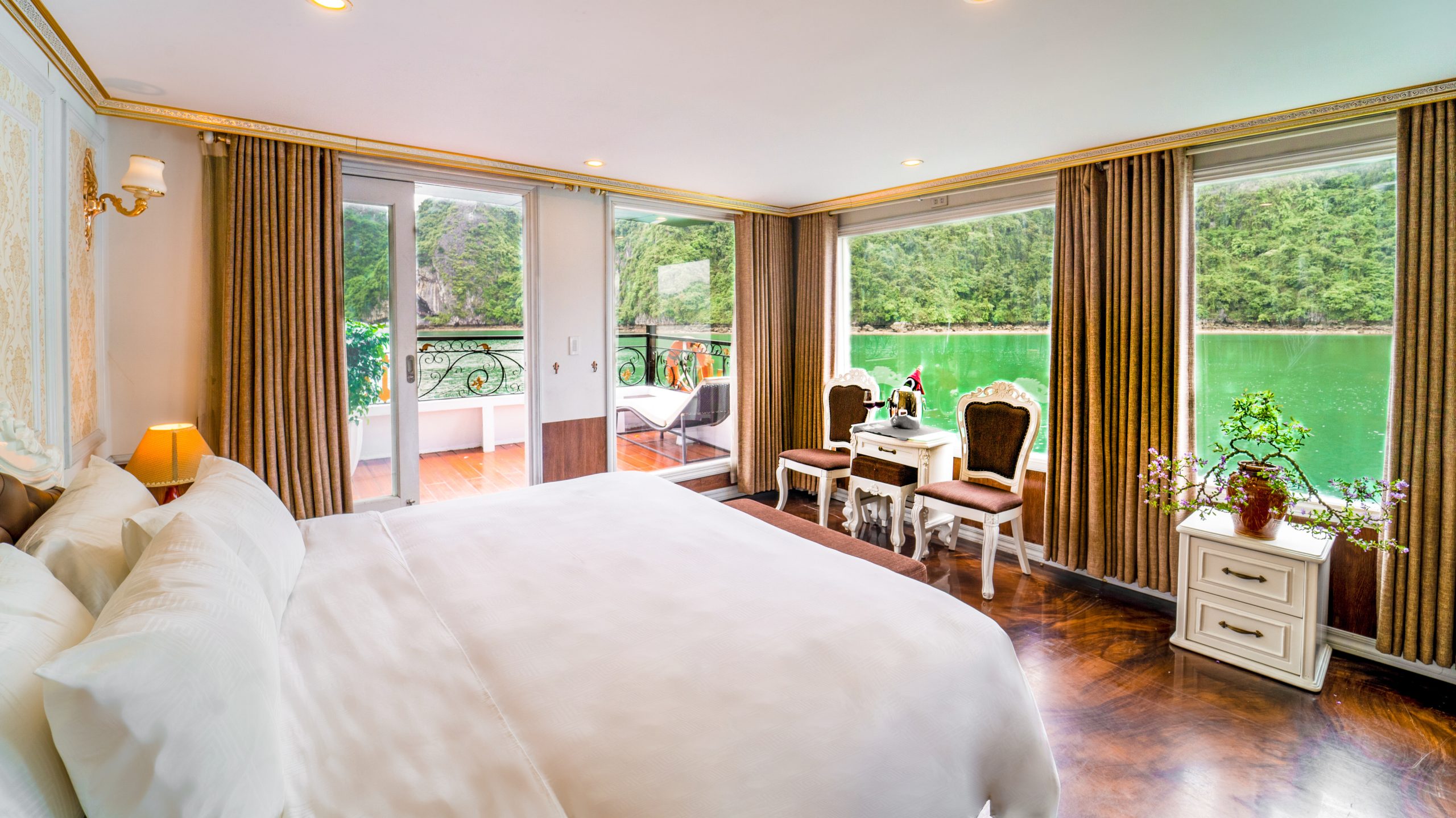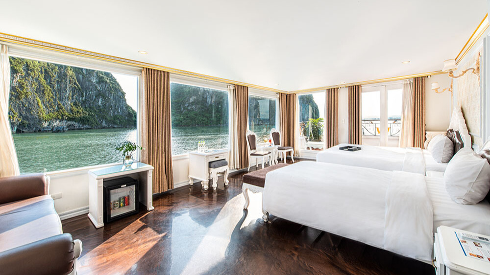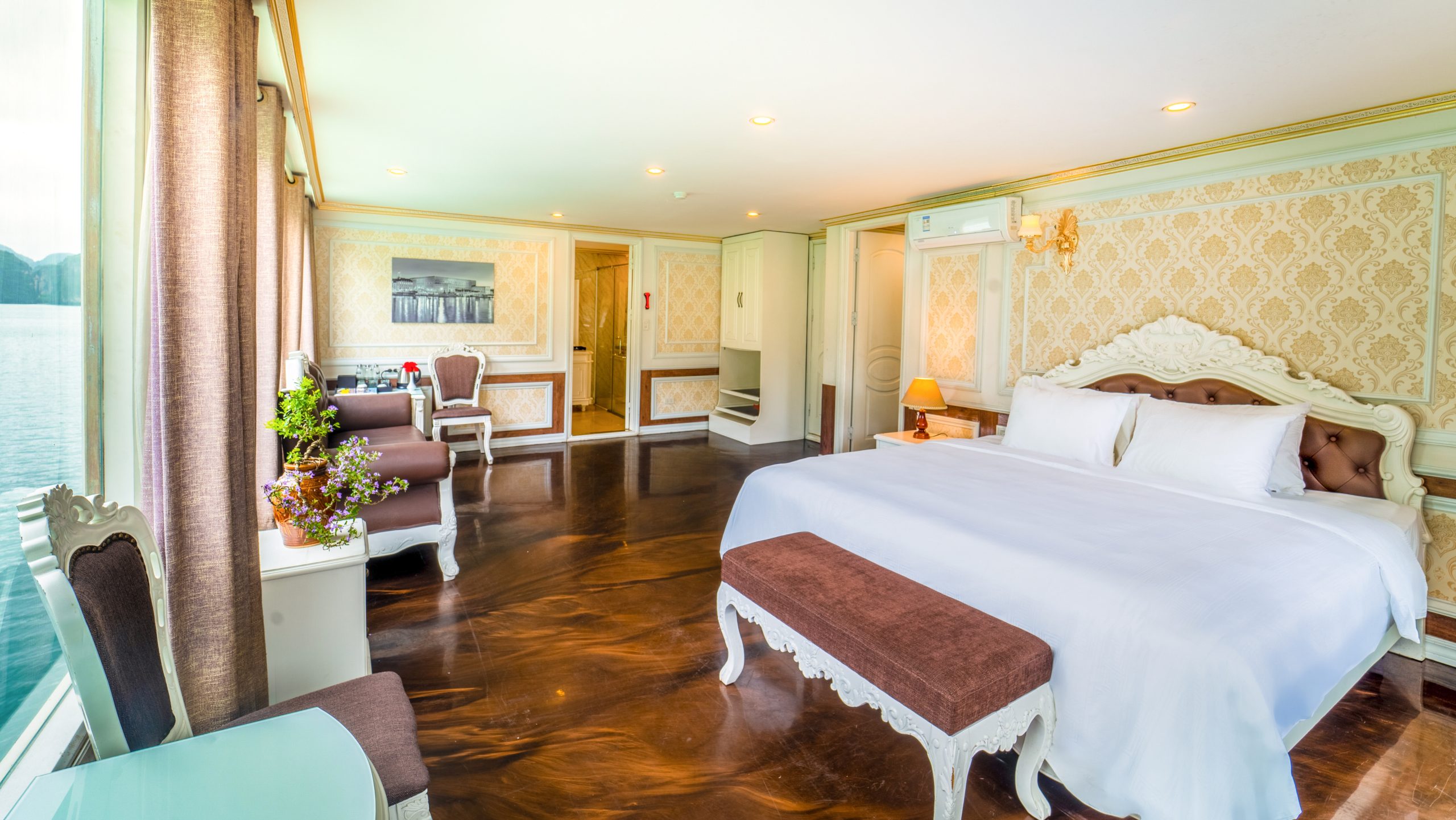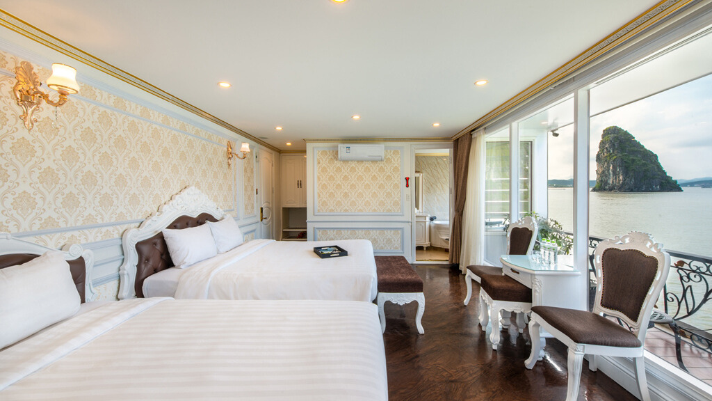 - 1 phòng Family Suite rộng 75m2 tọa lạc tại tầng 2 của du thuyền, đây sẽ là lựa chọn tối ưu dành cho những nhóm gia đình với 4 người lớn hoặc nhóm bạn. Phòng được bố trí ở vị trí đẹp nhất trên du thuyền (đuôi tàu tầng hai) với ban công riêng rộng lớn và bồn tắm view biển.