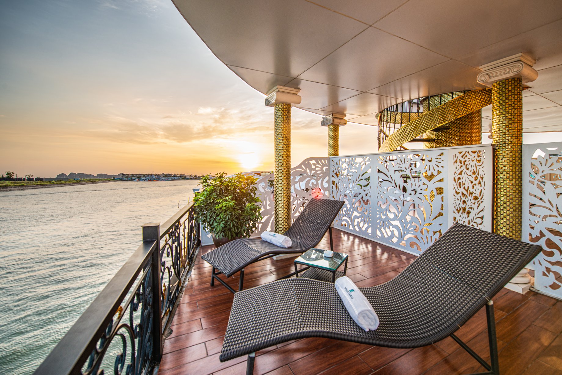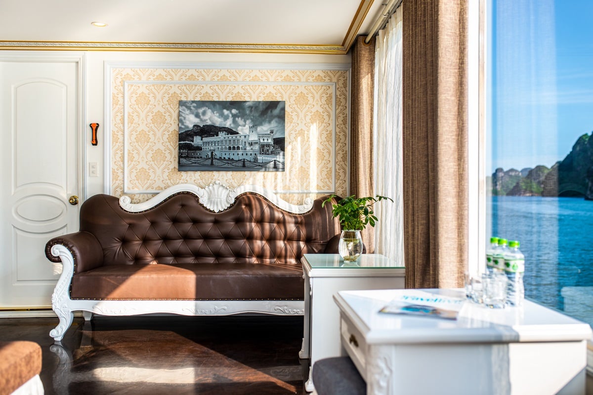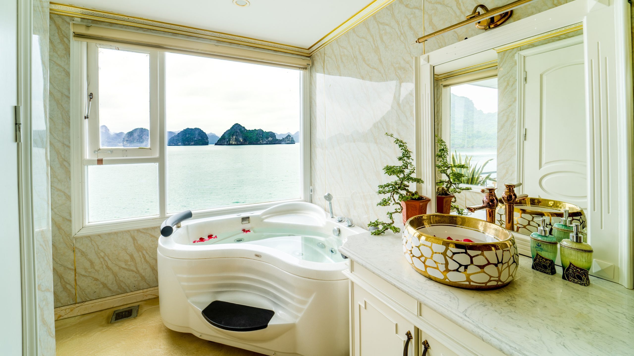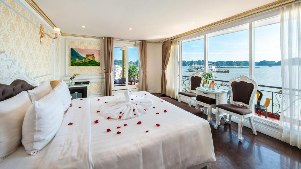 - 1 phòng Family Suite rộng 75m2 tọa lạc tại tầng 2 của du thuyền, đây sẽ là lựa chọn tối ưu dành cho những nhóm gia đình với 4 người lớn hoặc nhóm bạn. Phòng được bố trí ở vị trí đẹp nhất trên du thuyền (đuôi tàu tầng hai) với ban công riêng rộng lớn và bồn tắm view biển.