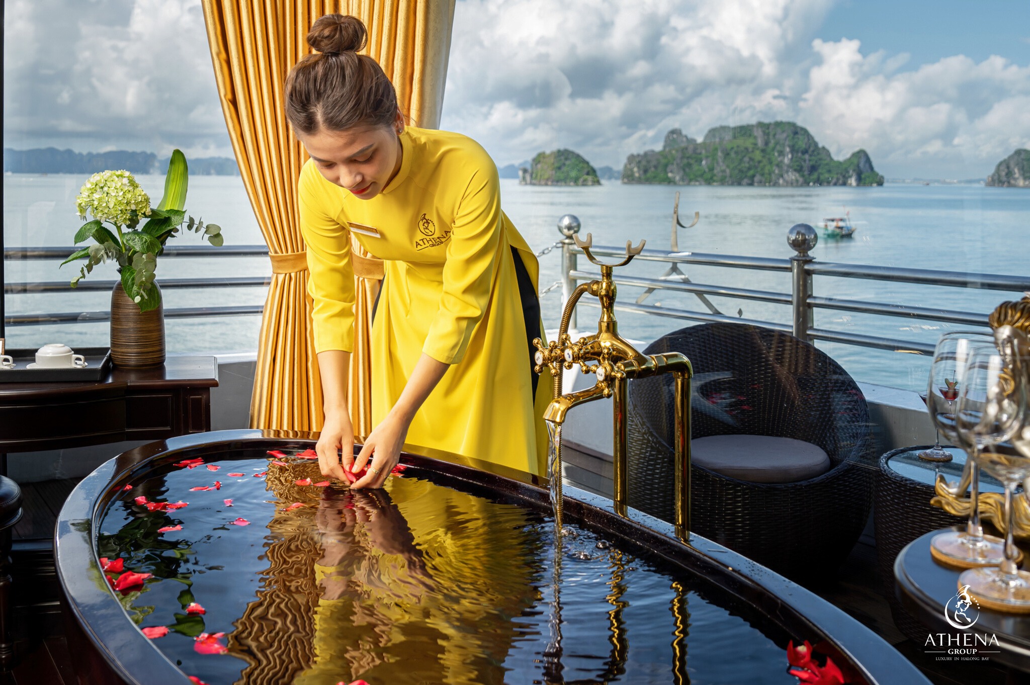 - Athena Royal Suite: Hạng phòng sang trọng nhất trên du thuyền nằm tầng 3, sở hữu bồn tắm gỗ độc đáo và ban công siêu rộng, được tặng kèm hoa quả tươi và 1 chai rượu vang