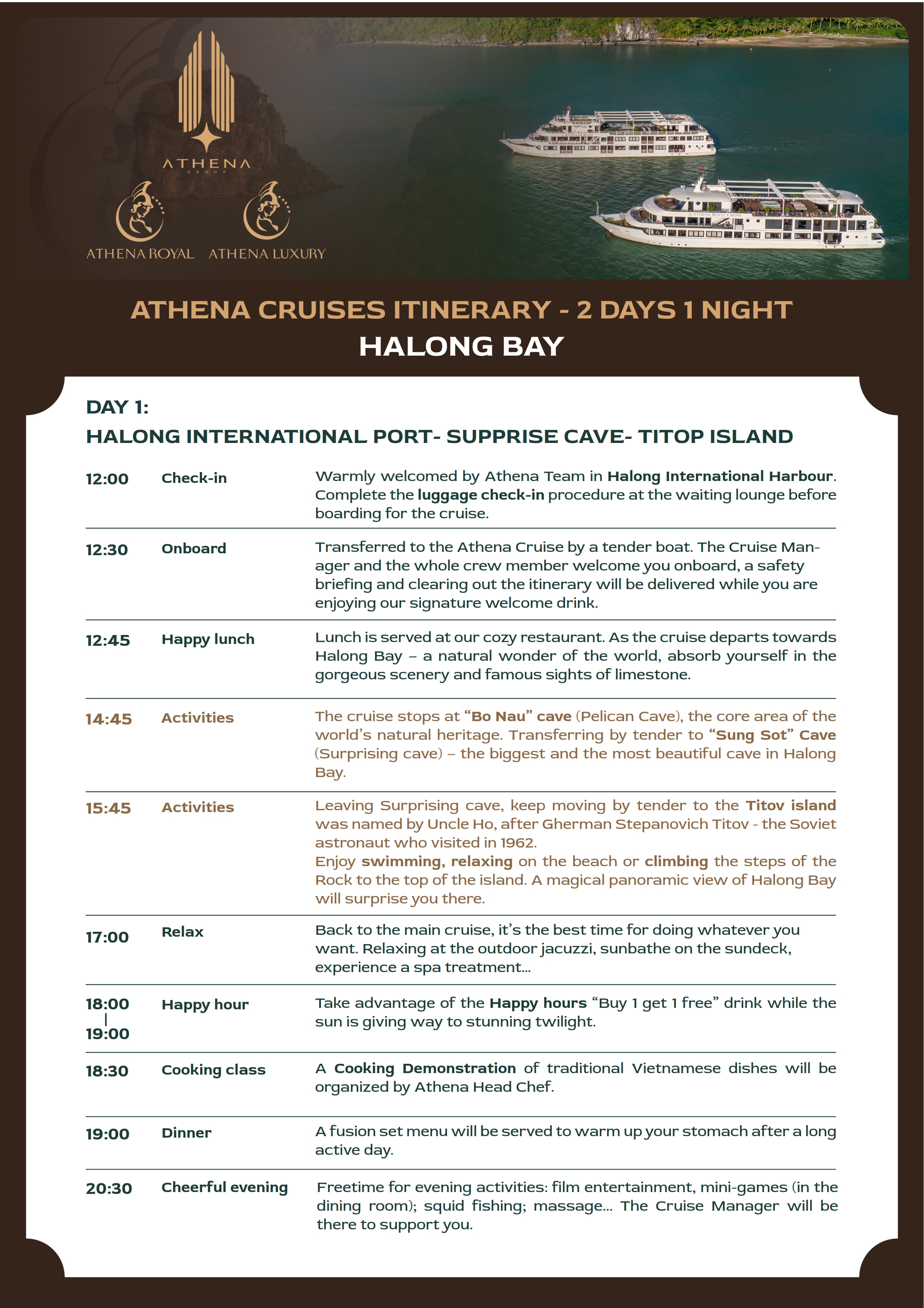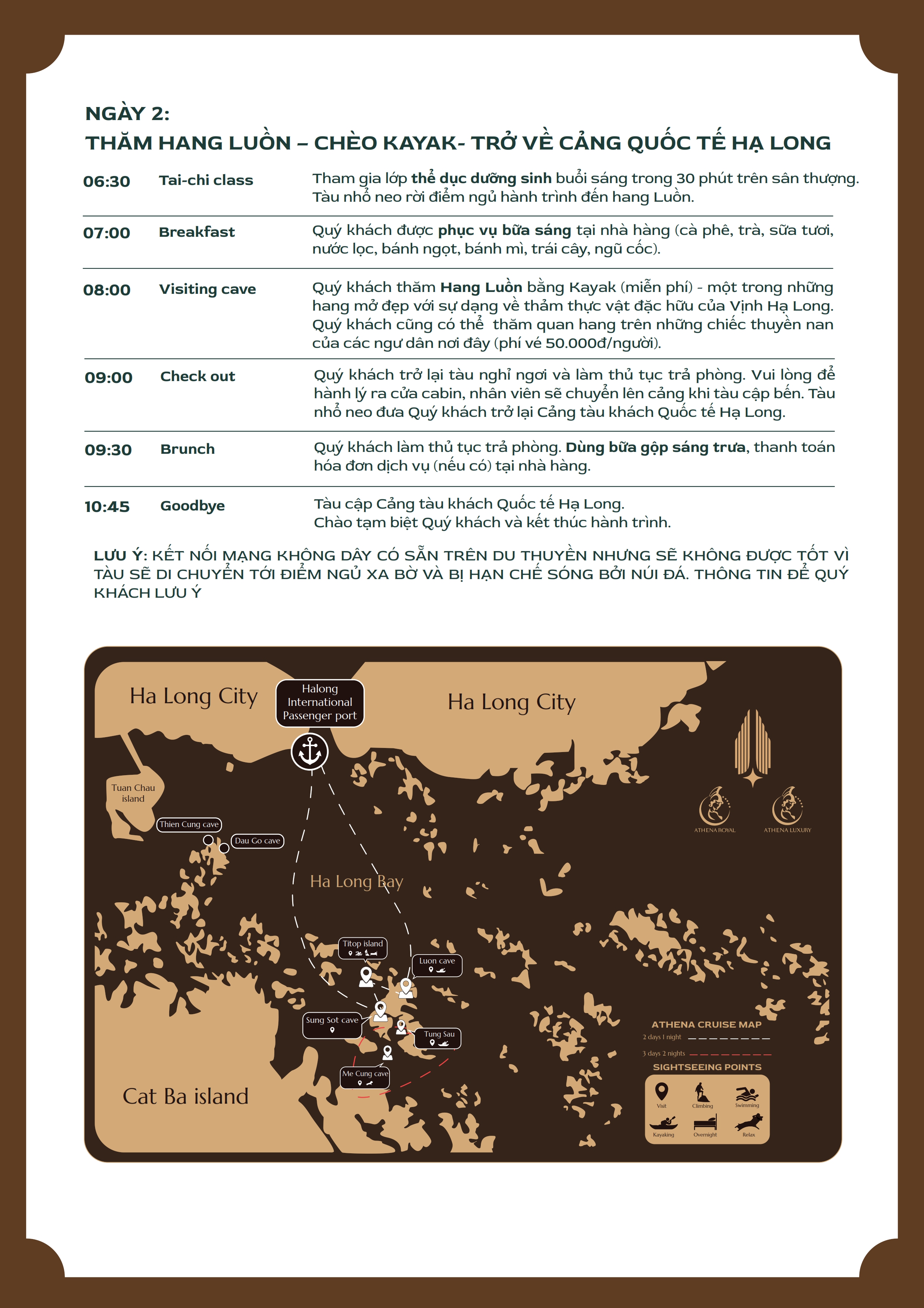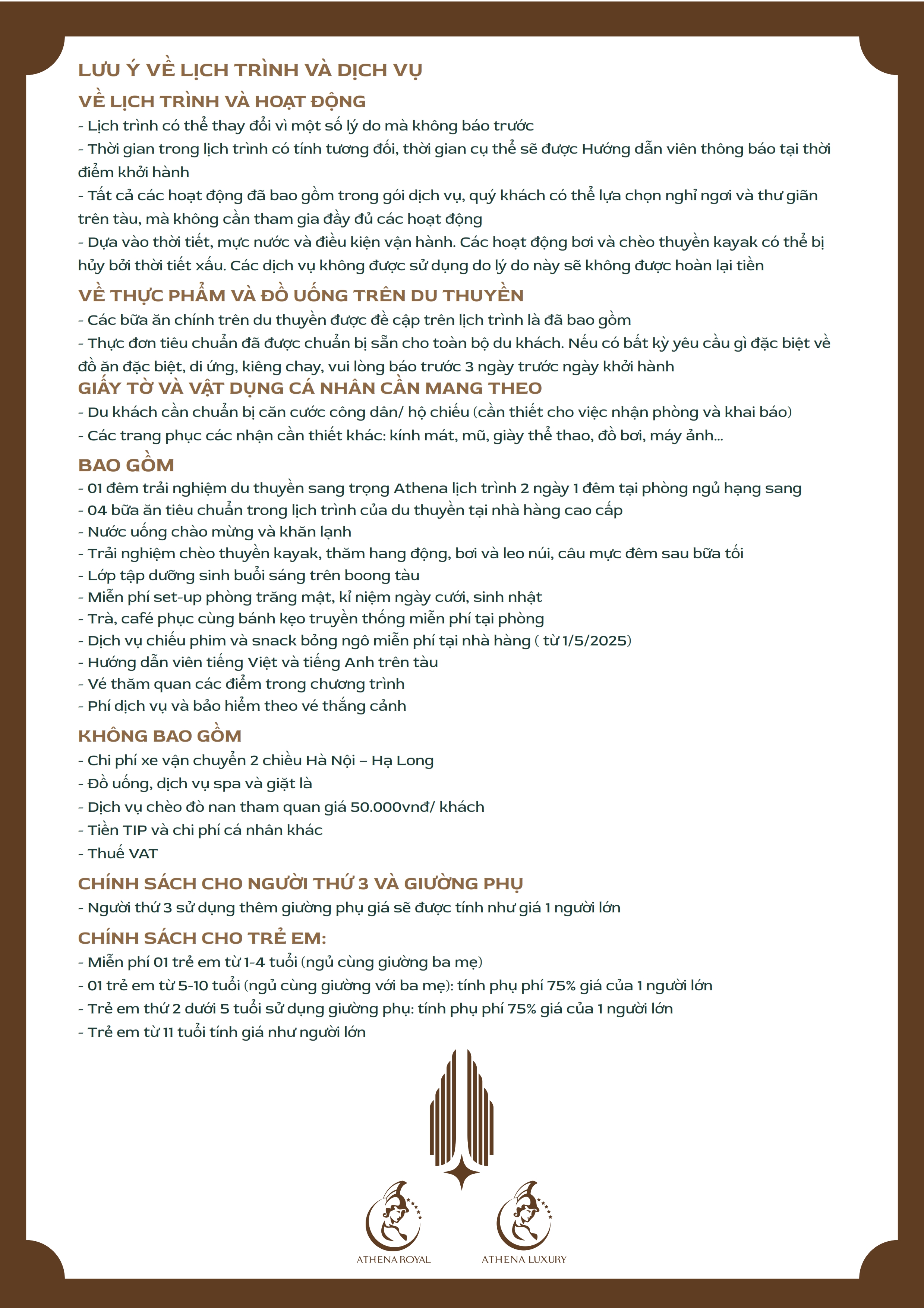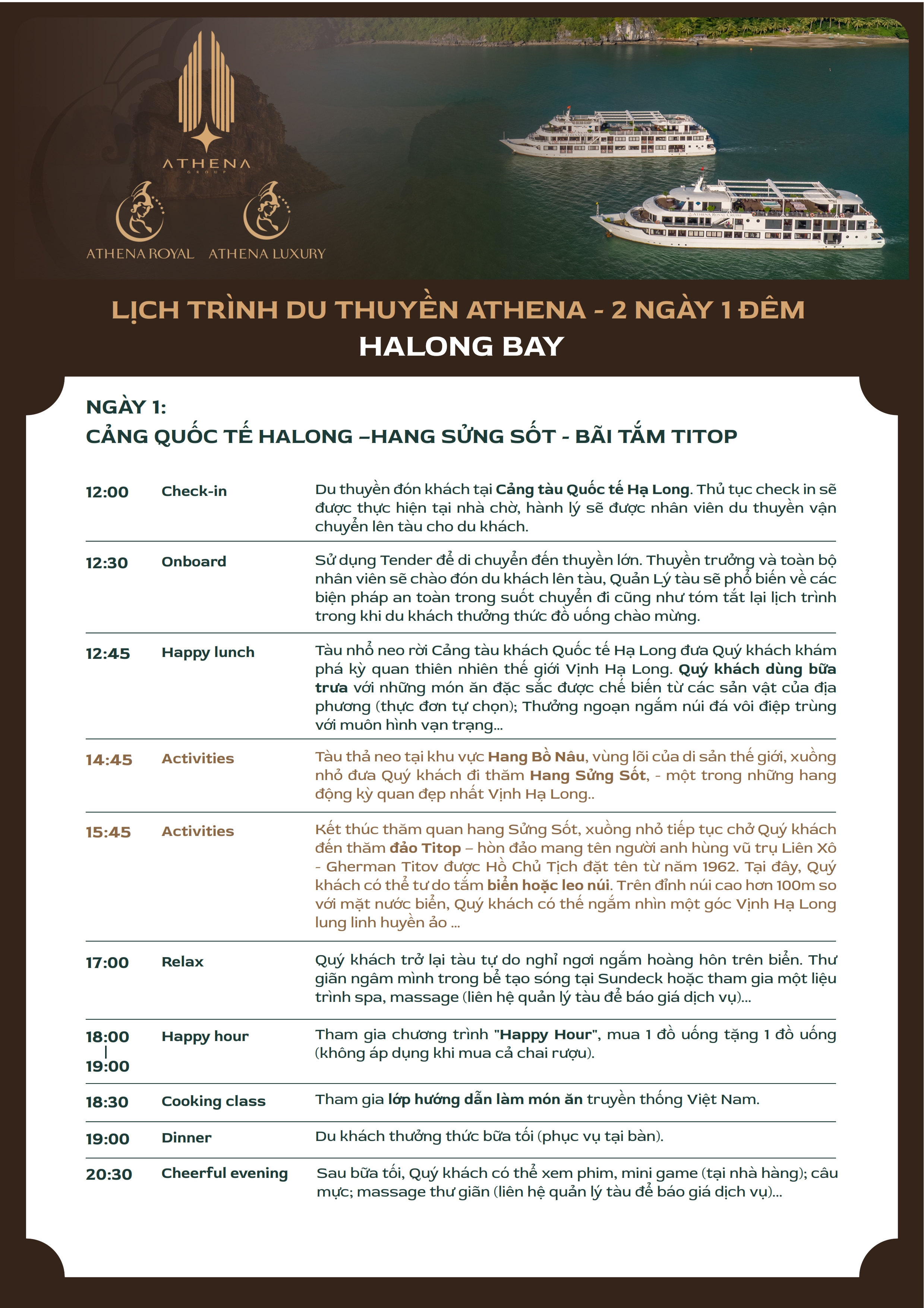 - 01 đêm trải nghiệm du thuyền sang trọng Athena lịch trình 2 ngày 1 đêm tại phòng ngủ hạng sang