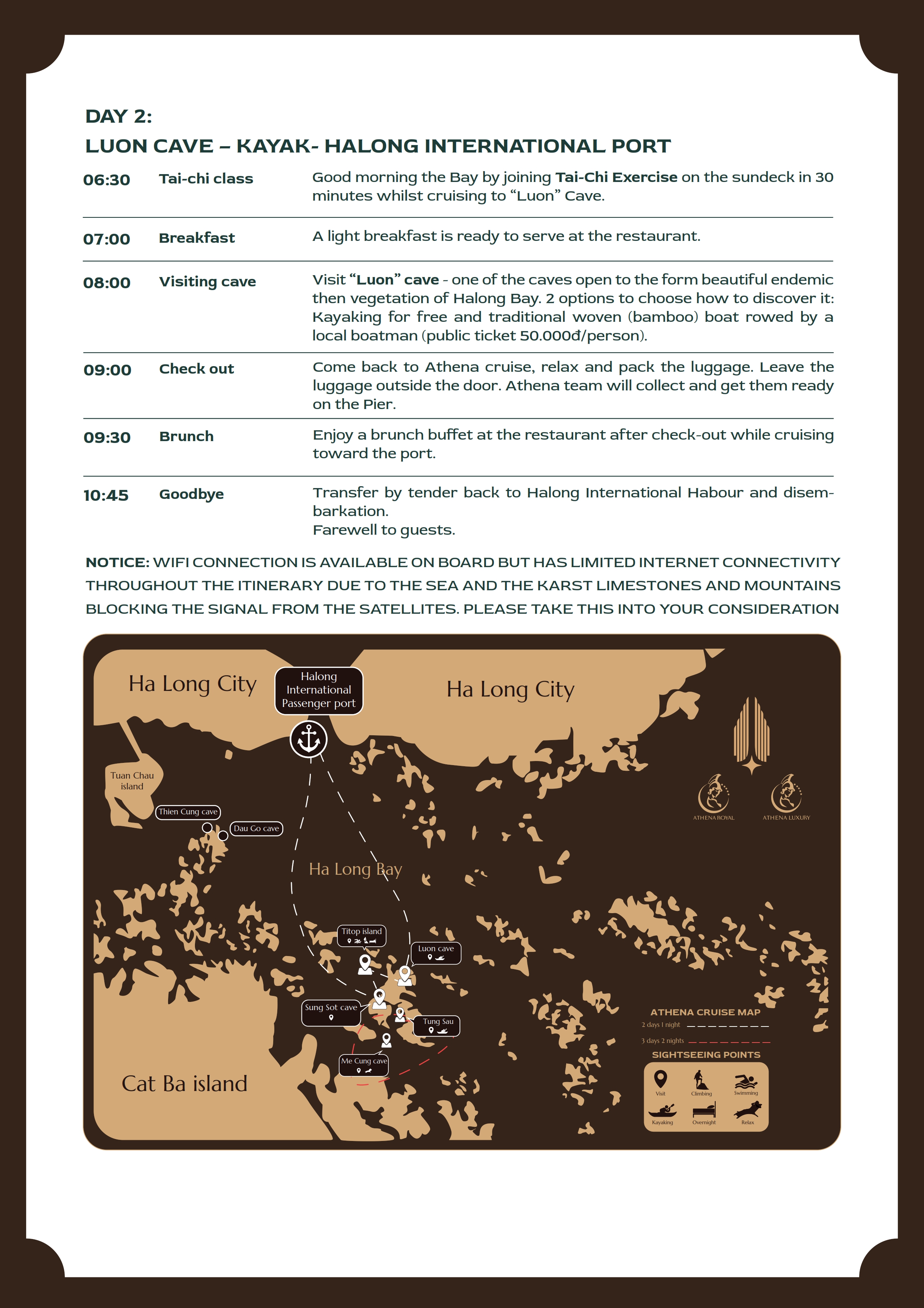 Du thuyền Athena Cruise sẽ đưa du khách tham quan Vịnh Hạ Long – 1 trong 7 kì quan thiên nhiên thế giới với 3 địa điểm nổi bật nhất: Là Hang Sửng Sốt – Hang động nổi tiếng đẹp tráng lệ với những khối thạch nhũ, măng đá hình thù độc đáo; Hang Luồn – trải nghiệm ngồi đò nan hoặc tự do chèo thuyền kayak, lênh đênh trên mặt nước biển đi qua những núi đá kì vĩ; hay đắm mình trong bãi cát trắng và làn nước trong xanh hoặc leo lên đỉnh ngắm tòa cảnh Vịnh Hạ Long tại đảo Titop.
