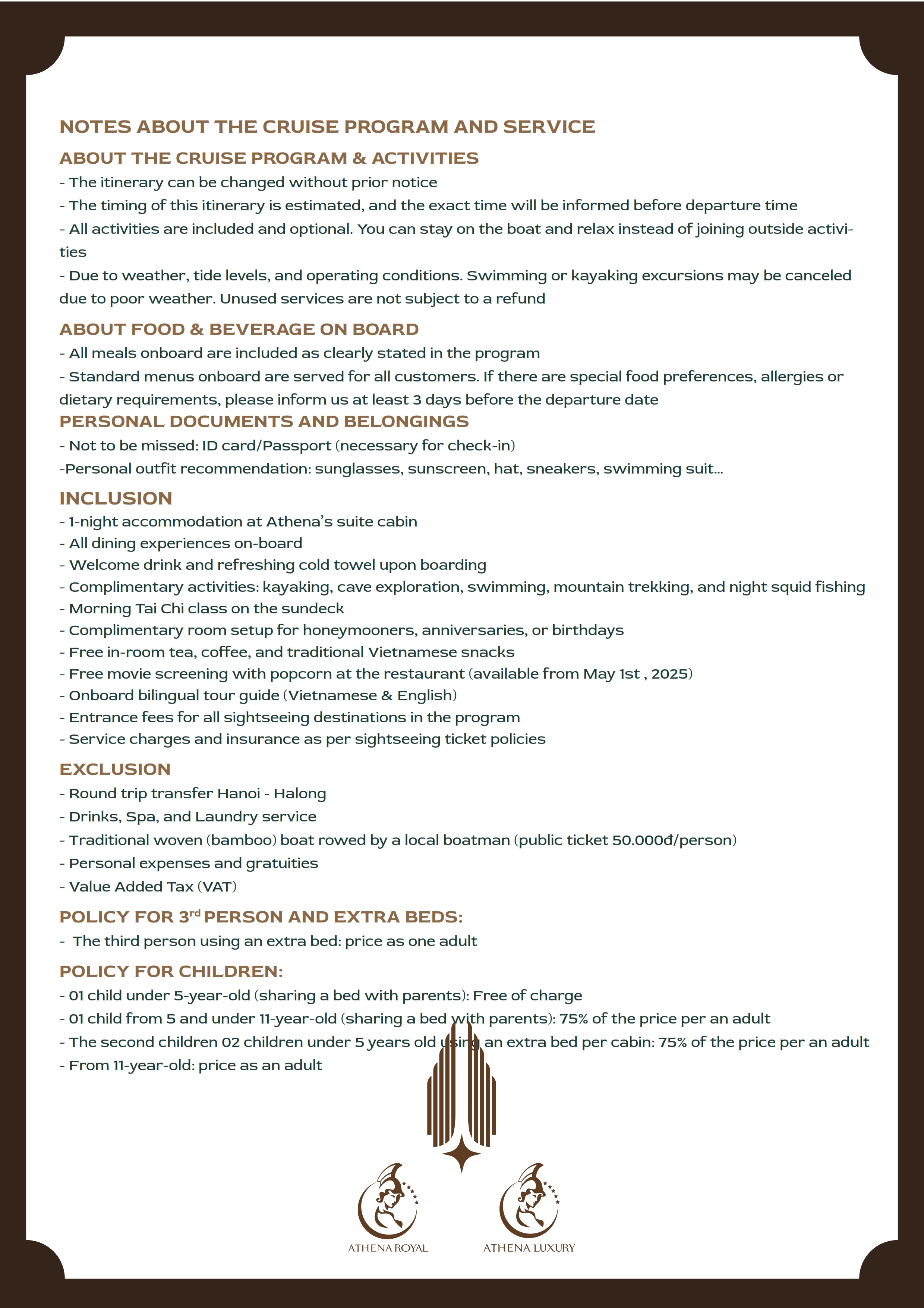 Du thuyền Athena Cruise bao gồm hai dòng sản phẩm chính: