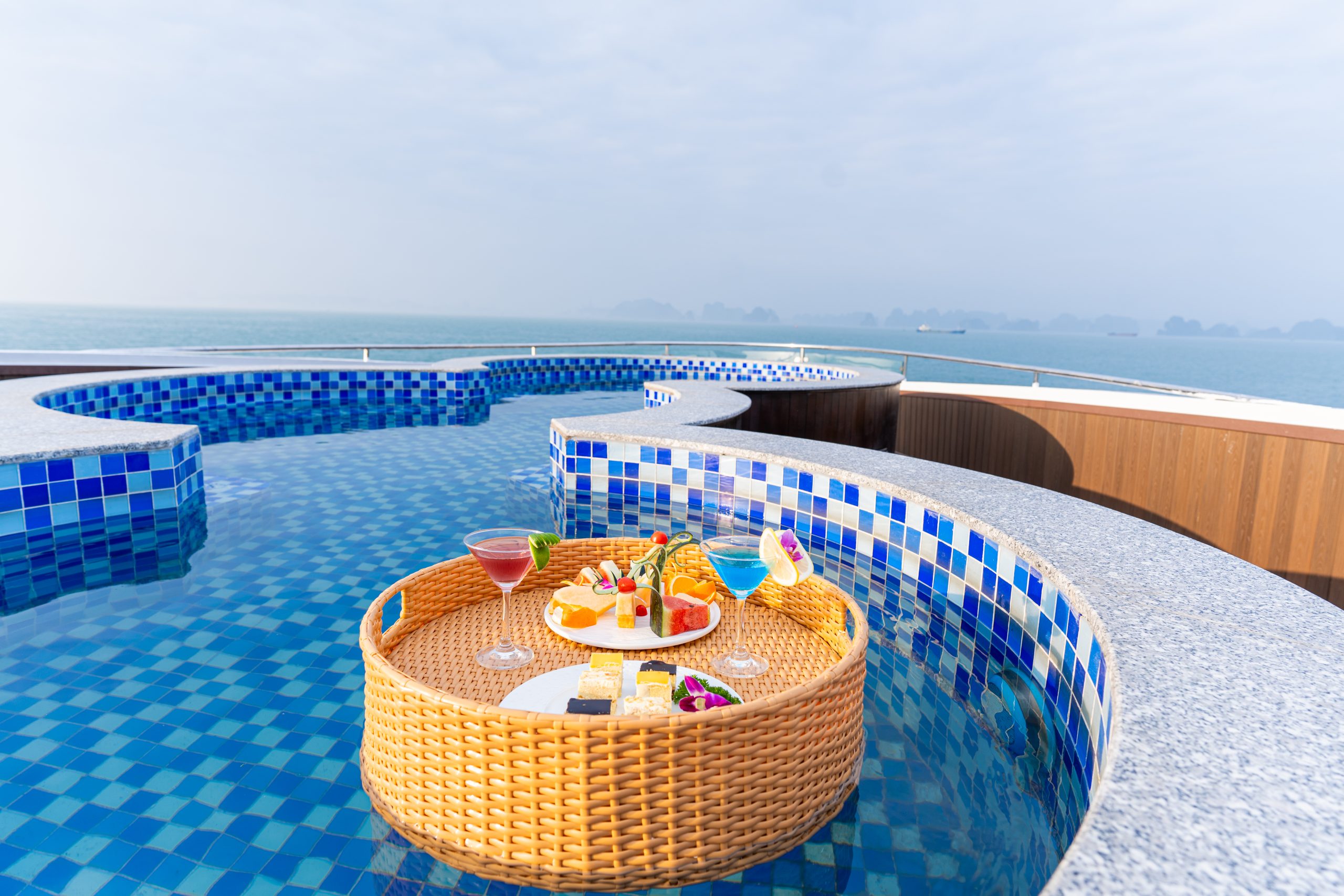 Đặc biệt, Bể sục Infinity với thiết kế mang âm hưởng hiện đại chính là một trong những biểu tượng độc đáo của Du thuyền Ha Long Symphony. Với hệ thống bể lọc và tạo bọt sủi Châu Âu, bể sục chính là nơi lý tưởng để du khách có thể đắm chìm trong làn nước trong xanh và chiêm ngưỡng cảnh quan panorama giữa lòng Vịnh. Khi hoàng hôn buông xuống, khu vực bể như tấm gương khổng lồ phản chiếu lại bầu trời, đem lại cảnh sắc ấn tượng, nên thơ và khó quên.