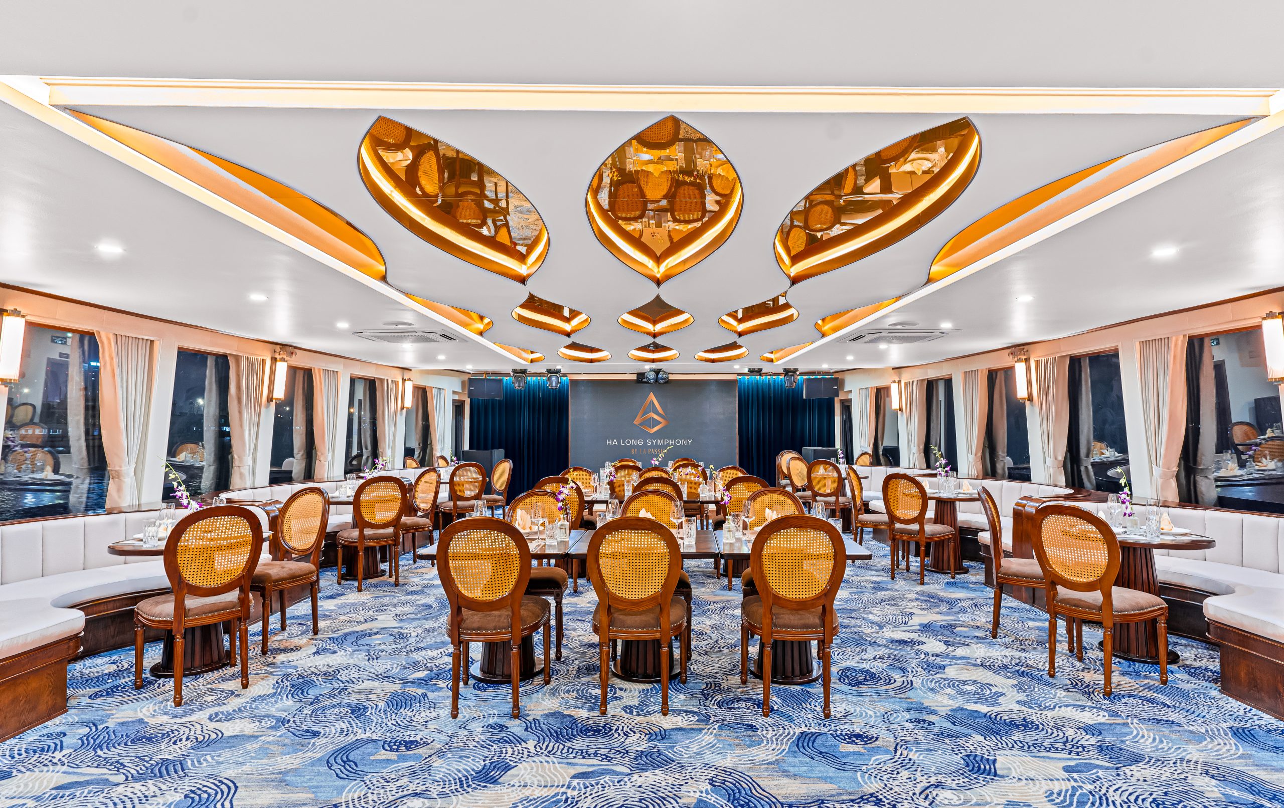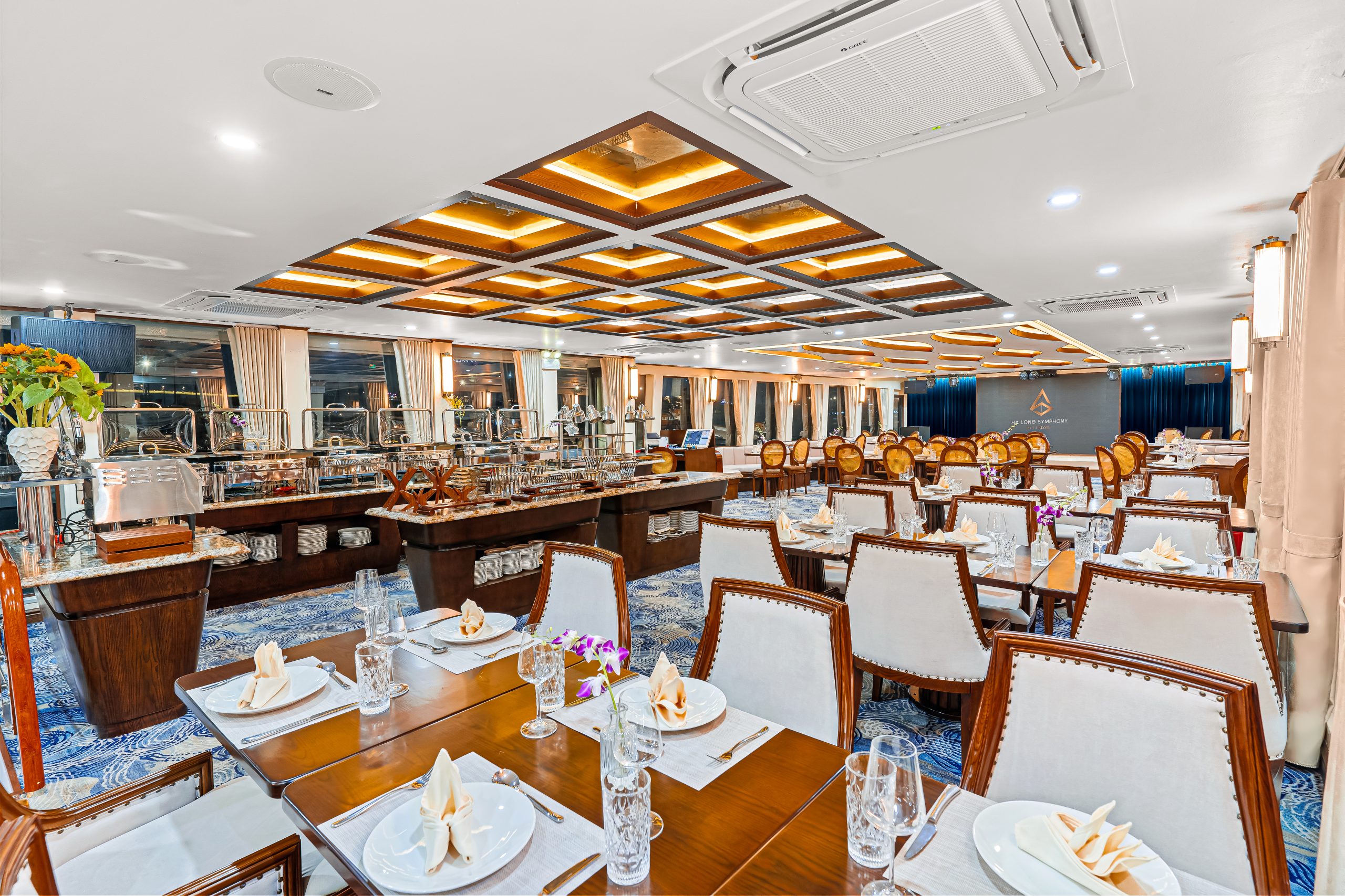 Nhà hàng trên du thuyền Hạ Long Symphony có sức chứa lên đến 200 khách, được trang bị sân khấu, TV màn hình LED lớn, phù hợp tổ chức nhiều sự kiện từ hội họp, đám cưới, gala event đến show diễn thời trang, âm nhạc hay cuộc thi sắc đẹp.