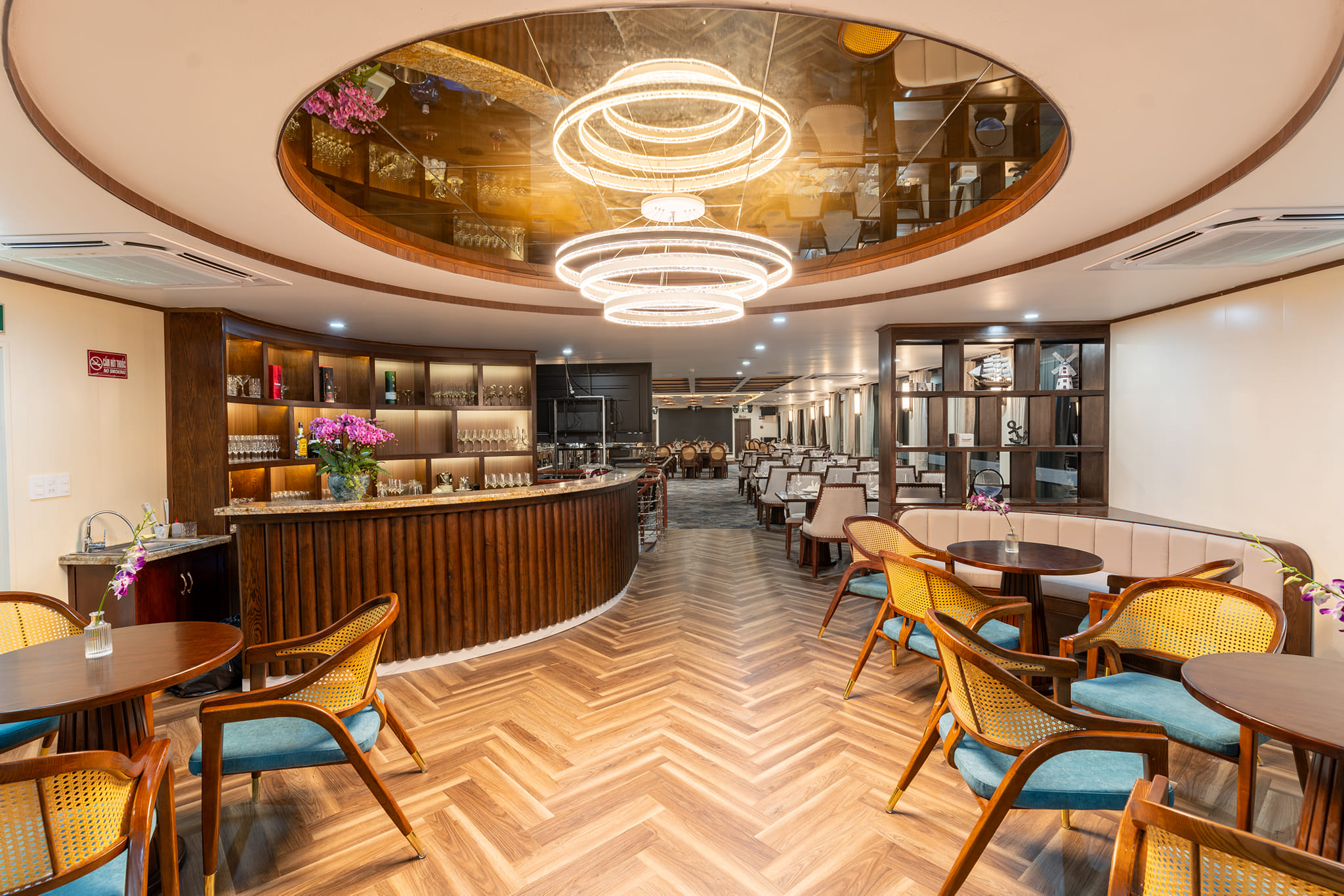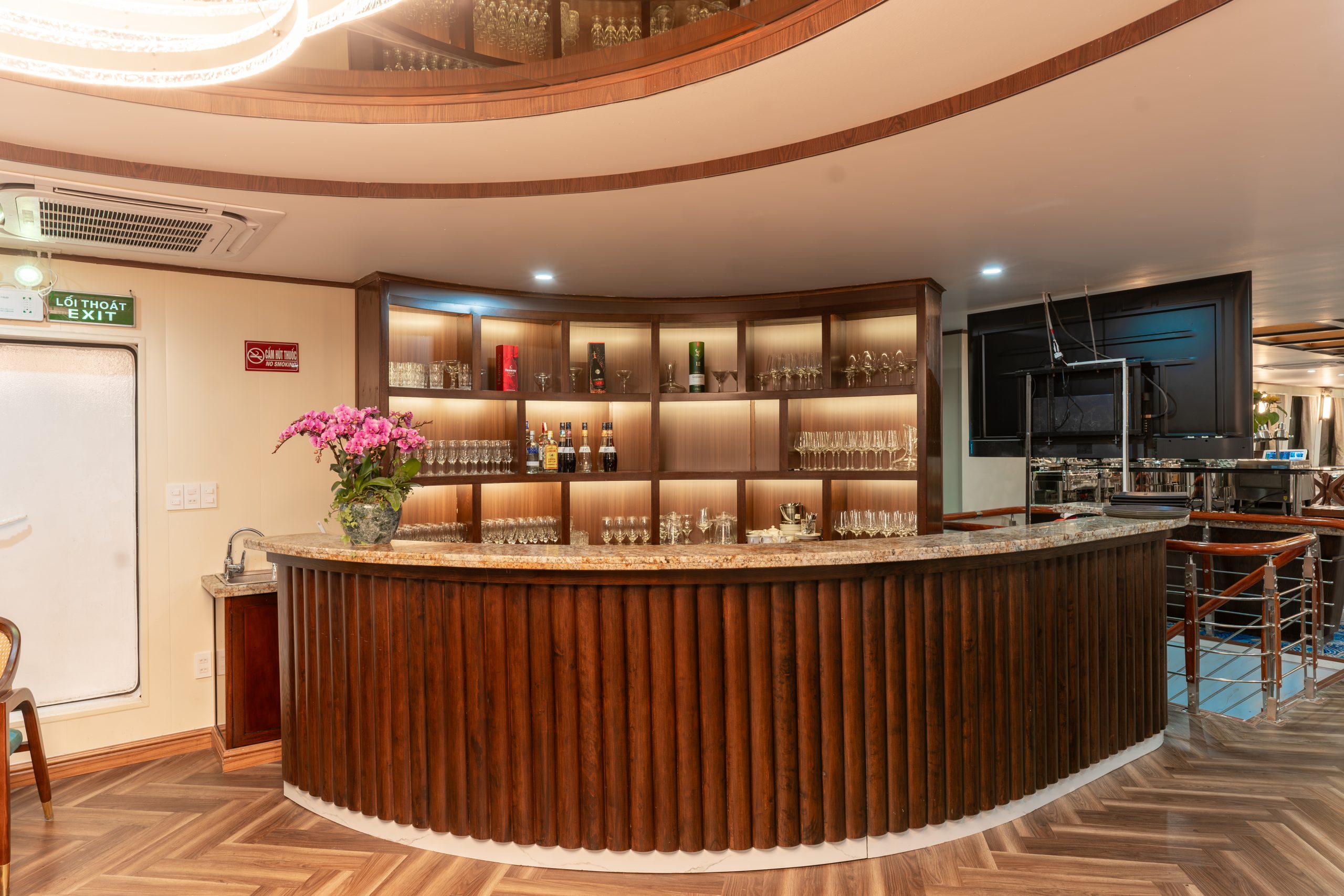 Du thuyền Ha Long Symphony có tới 2 Sky Bar nằm tại khu vực tầng 2 và tầng 3 để phục vụ nhu cầu thư giãn, giải trí của du khách. Tại đây, du khách sẽ được thưởng thức các loại đồ uống đa dạng, từ cocktail, rượu vang, đến nước trái cây tươi ngon. Không gian quán bar được thiết kế hiện đại và thoải mái, với ghế sofa êm ái và ánh sáng dịu nhẹ. Đây là nơi hoàn hảo để tận hưởng những giây phút thư giãn cùng bạn bè hoặc gia đình.