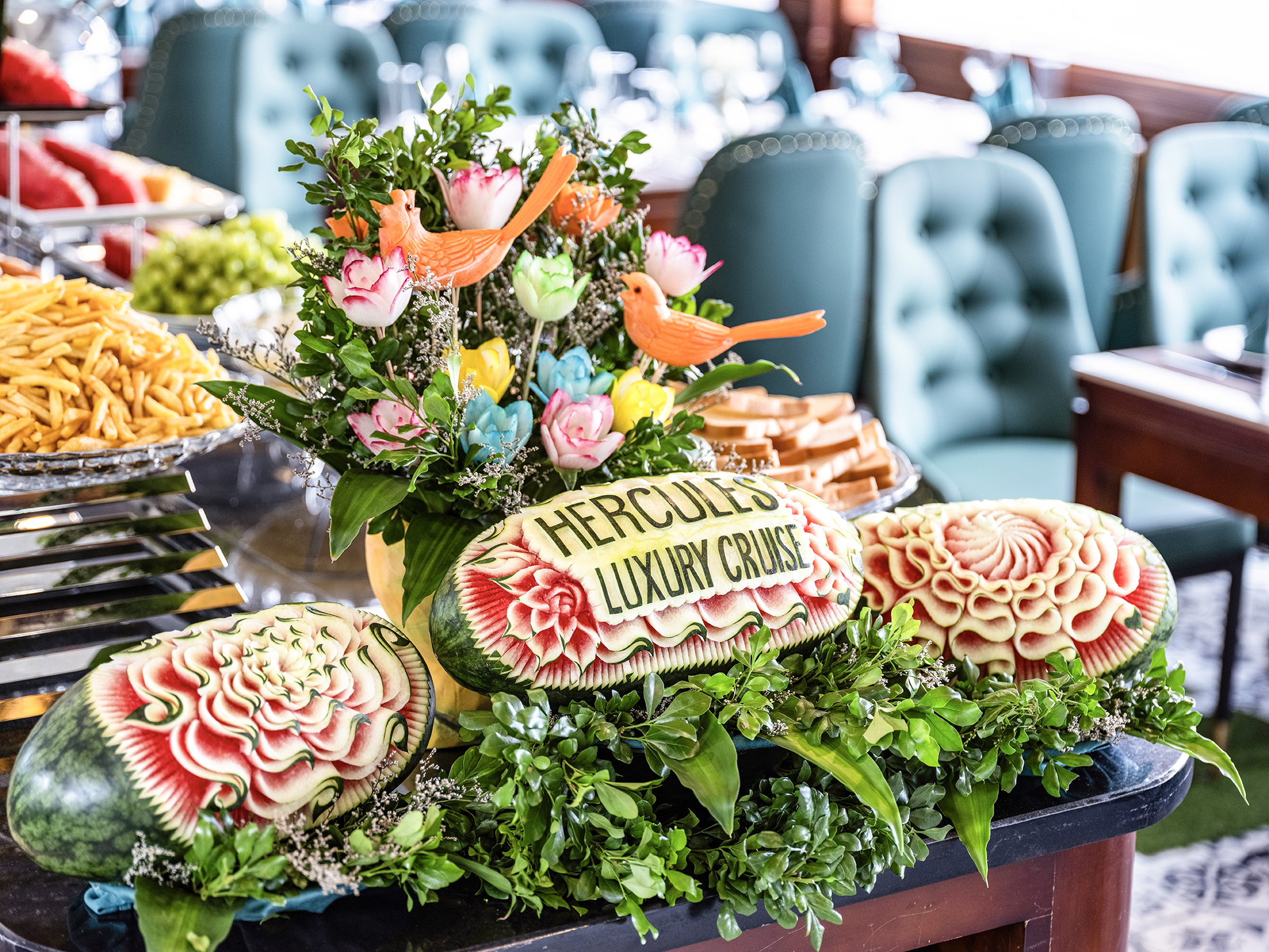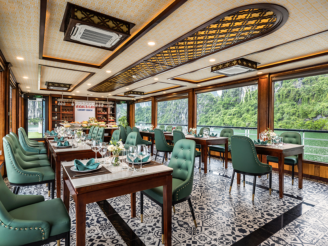 Một điểm nhấn ấn tượng hấp dẫn du khách của Hercules cruise là bữa trưa buffet với điểm nhấn là các món hải sản địa phương. Còn gì tuyệt vời hơn khi được thưởng thức hải sản Hạ Long trứ danh tươi rói được chế biến bởi các đầu bếp hàng đầu trong không gian nhà hàng sang trọng trên du thuyền ngay giữa Vịnh di sản.