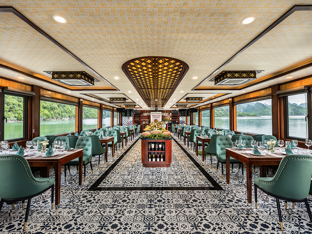 Qúy khách dùng bữa trưa buffet tại nhà hàng sang trọng trên tàu với thực đơn đa dạng các món ăn truyền thống, hải sản đặc sắc của vùng biển Hạ Long.