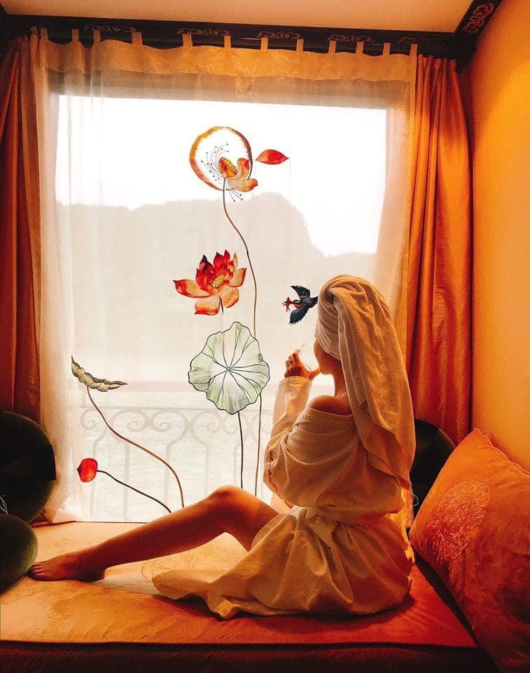 Giường ngủ của Junior Suite được đặt sát cửa kính cường lực lớn có 2 lớp rèm che, vừa đảm bảo sự riêng tư lại dành tặng bạn cả khoảng view tuyệt vời cực kỳ thơ mộng của một vùng vịnh nước lặng phủ đầy cây xanh.