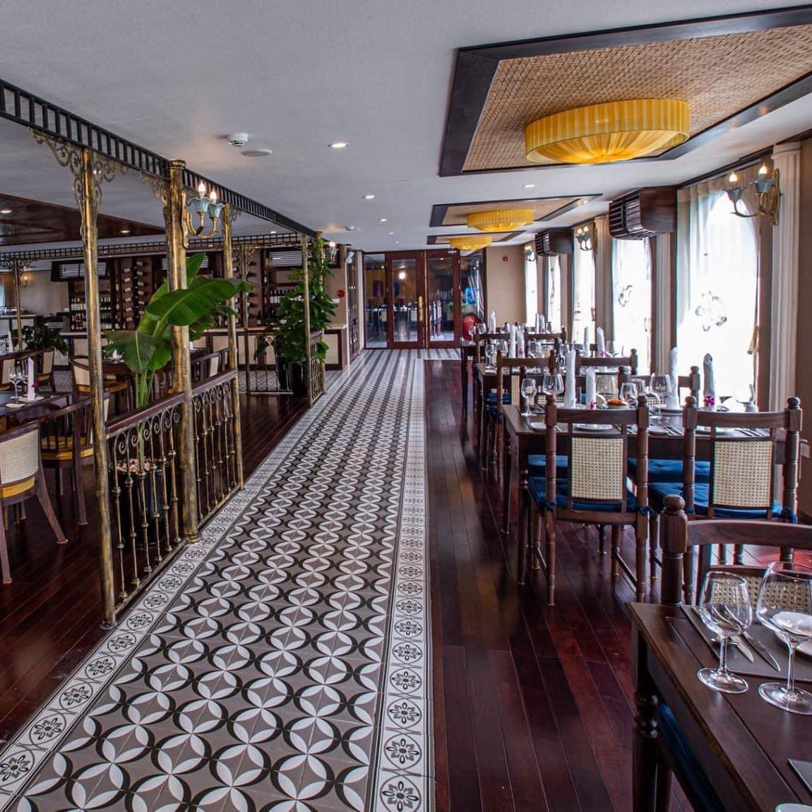 Mỗi hành trình 2 ngày 1 đêm của du thuyền Indochine, bạn sẽ có 04 lần được trải nghiệm ẩm thức từ buffet đến set menu theo kiểu âu tại nhà hàng Tonkin của du thuyền.