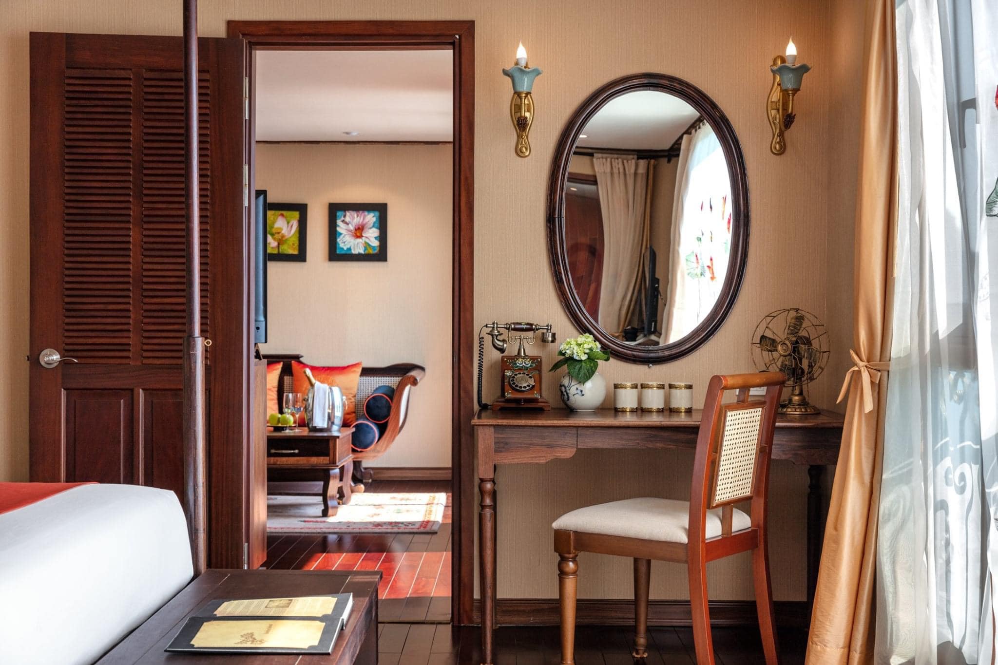 Phòng Suite cao cấp, rộng rãi với bộ bàn trà gỗ tự nhiên đặt trong cùng một không gian. Bức tranh sơn mài Làng nghề Hạ Thái “khổ lớn” trên trần nhà lạ mắt, đẩy tổng thể căn phòng toát lên vẻ đẹp tĩnh lặng, độc đáo của truyền thống Á Đông và sự lãng mạn, hiện đại của kiến trúc Pháp