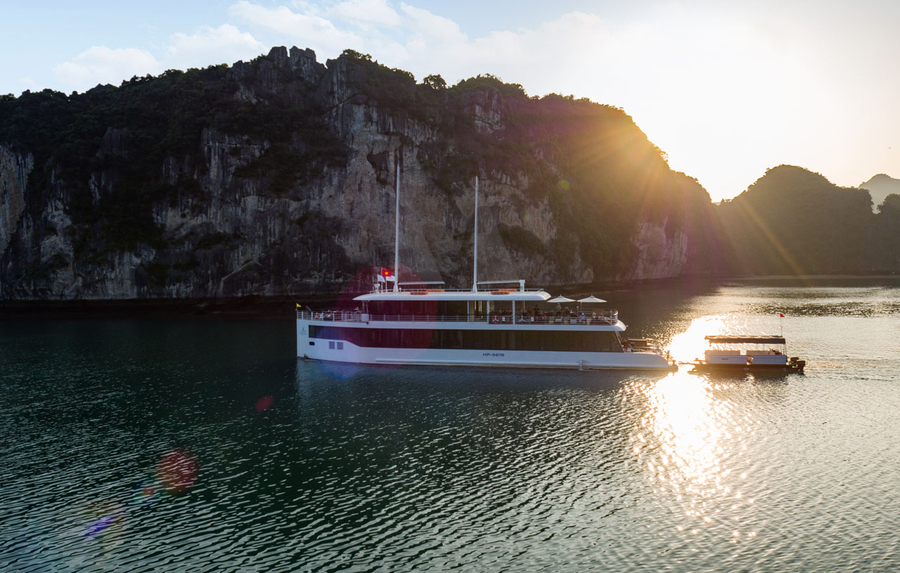 – Đây là khoảng thời gian đẹp nhất trong ngày và là cơ hội tuyệt vời để Quý khách ngắm cảnh hoàng hôn buông dần trên vịnh từ giường phơi nắng trên nóc của du thuyền (sundeck) hoặc tham gia bữa tiệc rượu, hoa quả cùng giao lưu, làm quen với những người bạn mới hoặc thư giãn trên Du thuyền.