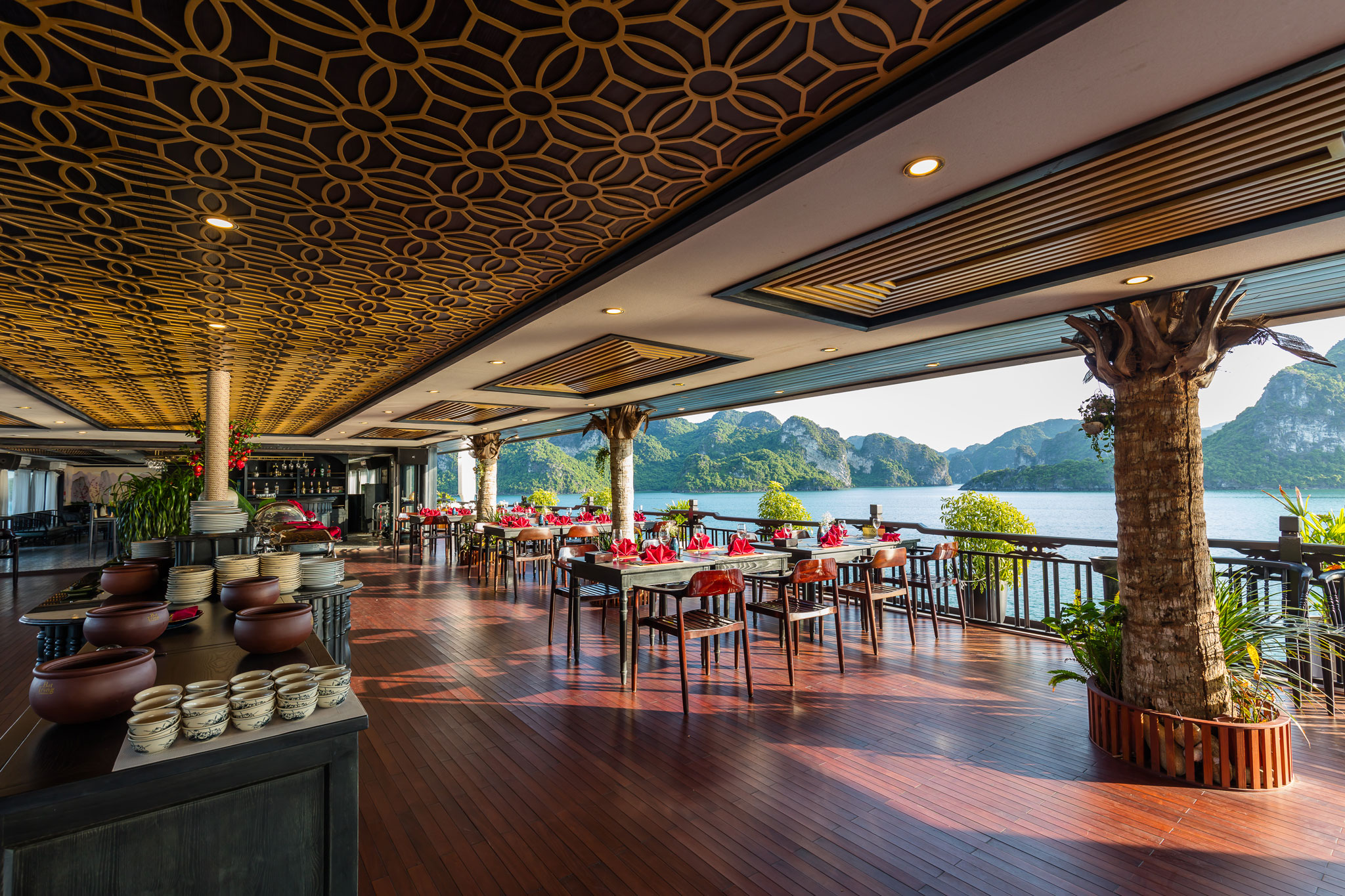 - Nhà hàng Hạ Long ở tầng 2 của du thuyền có sức chứa lên tới 100 khách cùng thiết kế kính tràn vô cực tạo cảm giác không khoảng cách với không gian hùng vĩ ngay bên ngoài