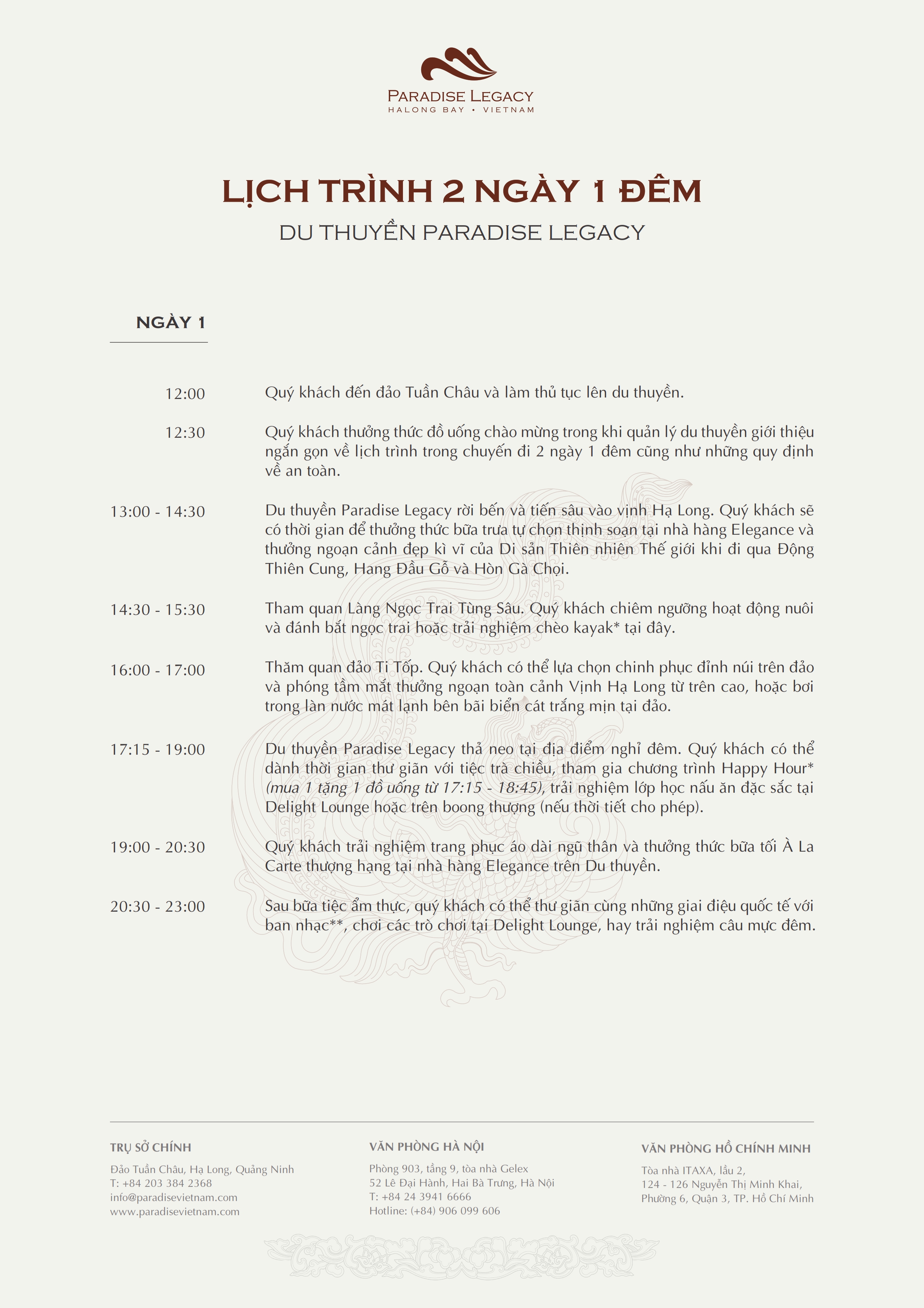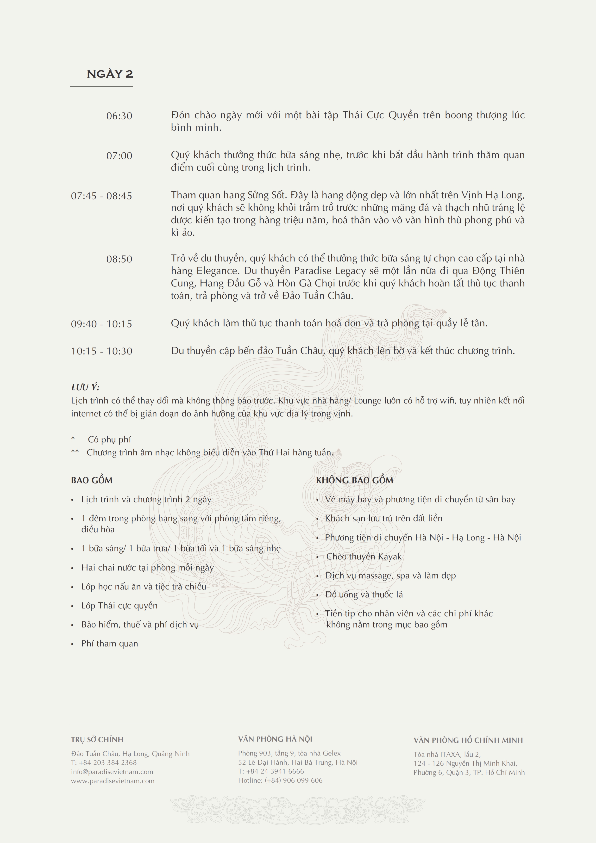 👉 Liên hệ ngay Du thuyền Hạ Long – Lan Hạ để được tư vấn chi tiết và đặt phòng Du thuyền Paradise Legacy với mức giá tốt nhất.