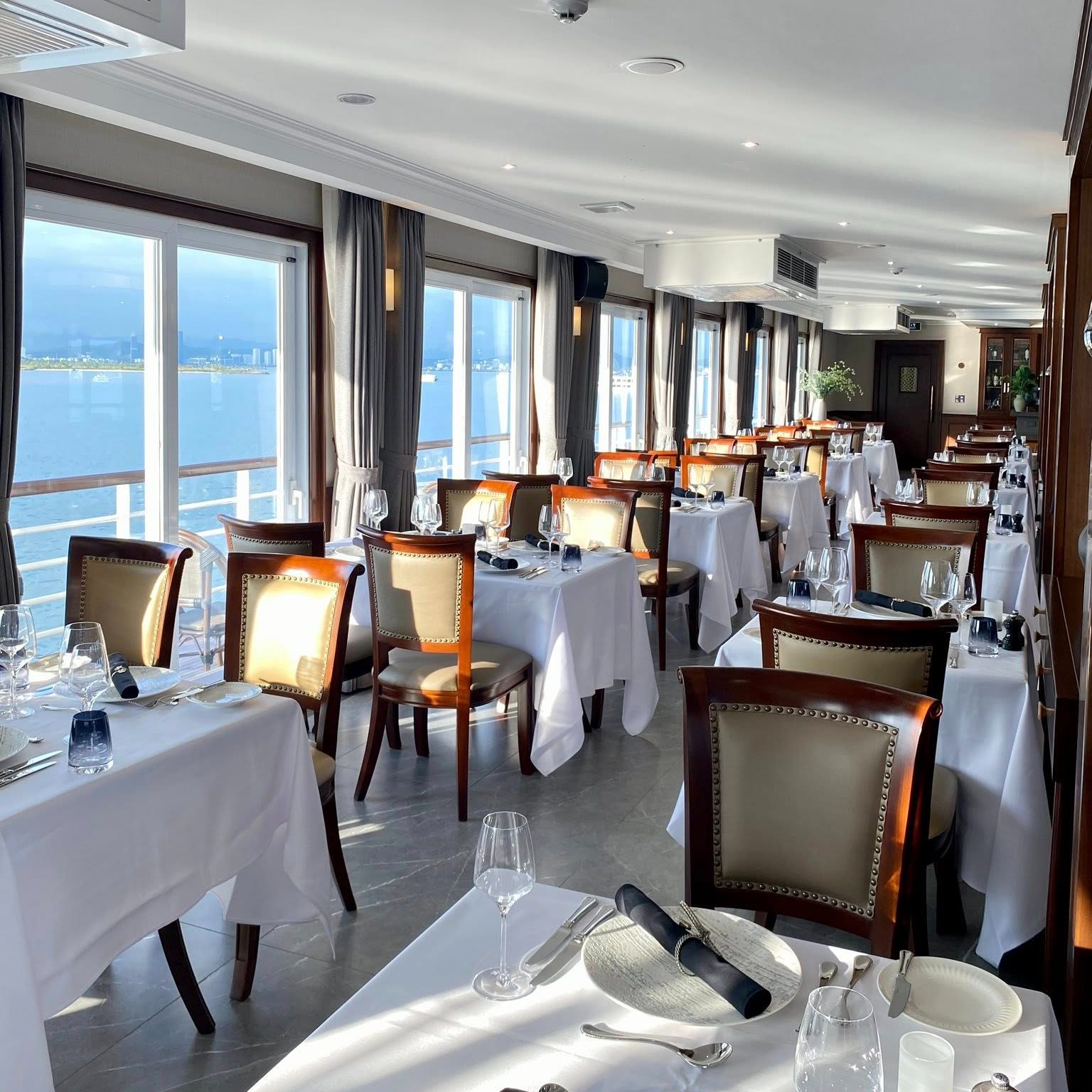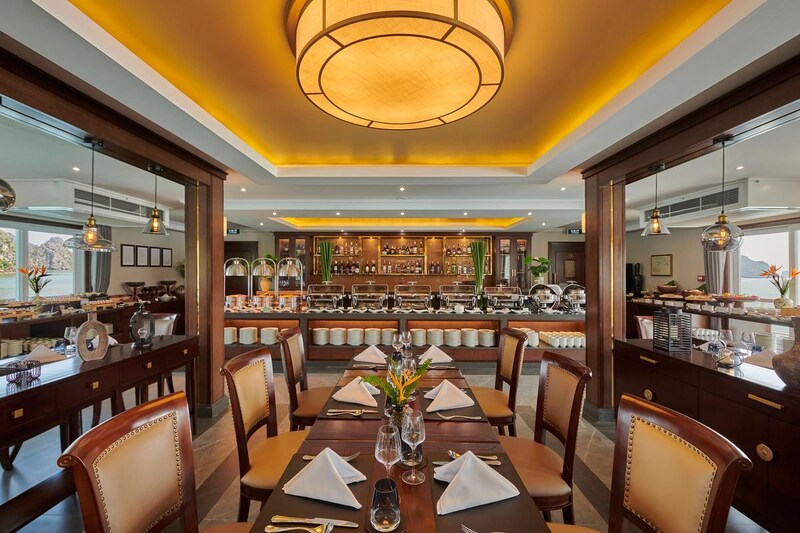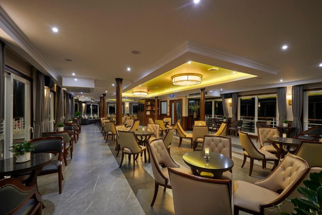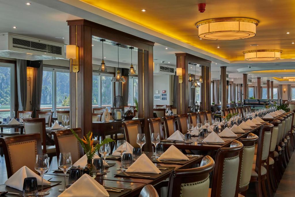 Ẩm thực là một trong những điểm nổi bật tạo nên sức hút của Du thuyền Paradise Legacy. Du thuyền sở hữu không gian nhà hàng và lounge nối liền, thiết kế mở, tràn ngập ánh sáng tự nhiên. Sân khấu trung tâm với đàn piano và ban nhạc quốc tế mang đến không khí sang trọng, thư giãn.