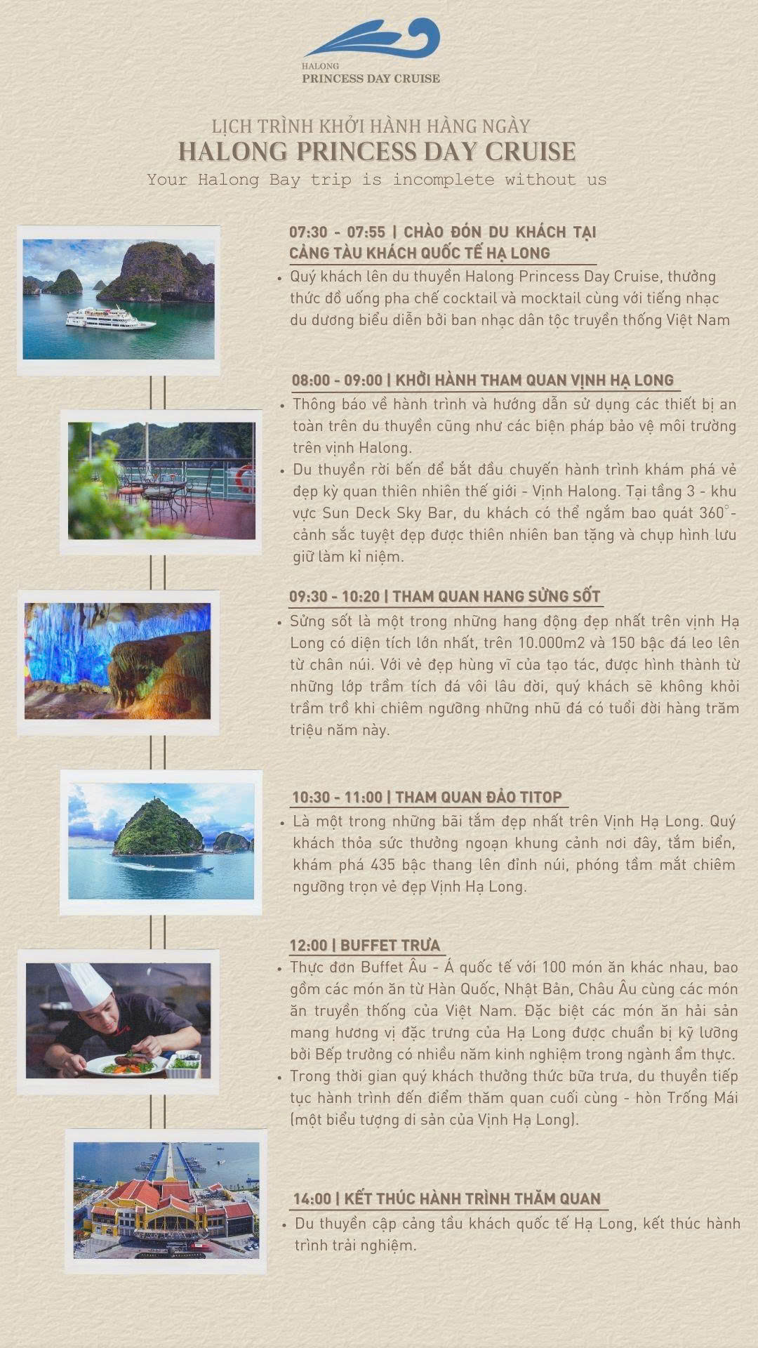 Trên chuyến phiêu lưu cùng Princess Day Cruise, du khách sẽ lạc vào bức tranh sống động của Vịnh Hạ Long vào những giờ vàng rực rỡ nhất của ngày mới hoặc hoàng hôn buông. Những khối đá vôi khổng lồ sừng sững, làn nước xanh thẳm lấp lánh và ánh nắng dịu dàng tạo nên khung cảnh hoàn mỹ cho bữa tiệc ngoài trời lãng mạn hay sự kiện doanh nghiệp đẳng cấp. Tour không chỉ chinh phục vẻ đẹp tạo hóa với địa hình karst độc đáo và hệ sinh thái phong phú, mà còn khám phá sâu sắc văn hóa địa phương qua các điểm dừng chân huyền bí, từ hang động cổ kính đến làng chài truyền thống, cùng câu chuyện lịch sử và con người mến khách của Quảng Ninh.