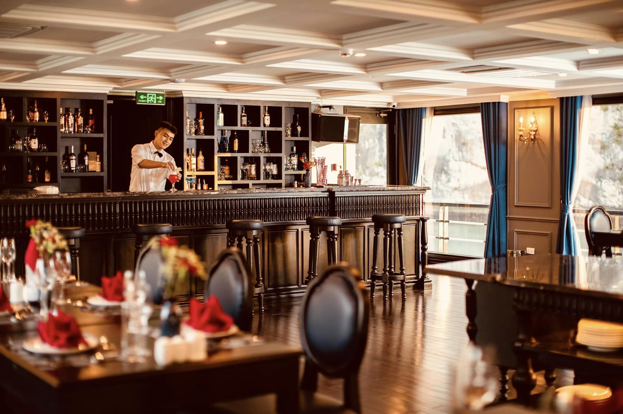 Nằm ở tầng 4 của du thuyền, nhà hàng Fine Dining của Du thuyền Rosy Cruise được thiết kế theo phong cách sang trọng, tinh tế cùng view toàn cảnh bao trọn vịnh di sản chắc chắn sẽ mang lại ấn tượng khó quên cho du khách.