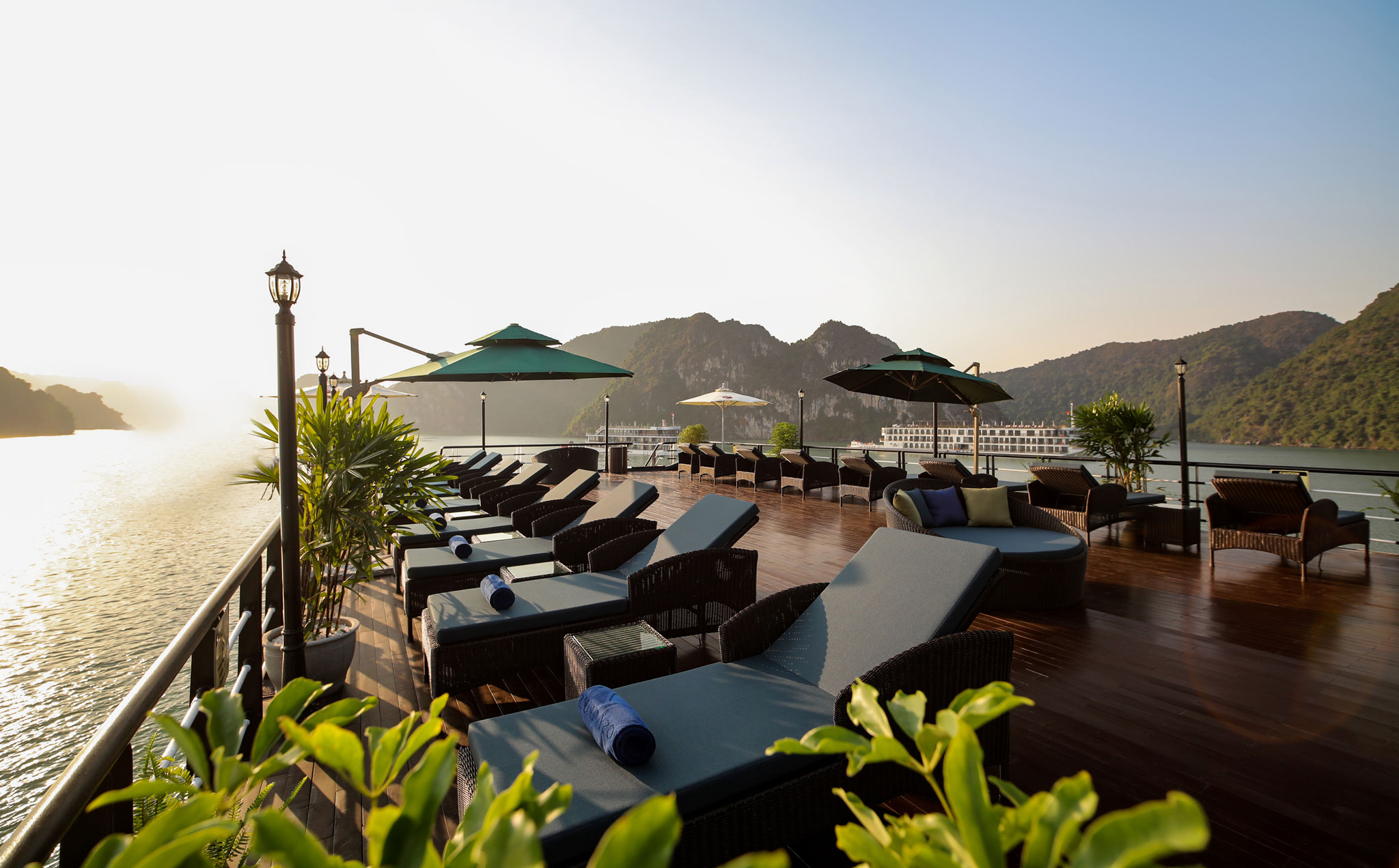 Một điểm nhấn ấn tượng nữa của Rosy Cruise là phần sân thượng nằm trên tầng 5 trên cùng của du thuyền nơi du khách có thể dễ dàng thả hồn mình tận hưởng trọn vẹn hương vị của vịnh Lan Hạ danh tiếng hay “refesh” bản thân vào mỗi buổi sáng với chương trình tập Thái Cực Quyền được hướng dẫn bởi các chuyên gia. Tiệc trà chiều Canape ngắm hoàng hôn trên sundeck cũng sẽ là những kỷ niệm để đời của du khách cùng du thuyền Rosy cruise.