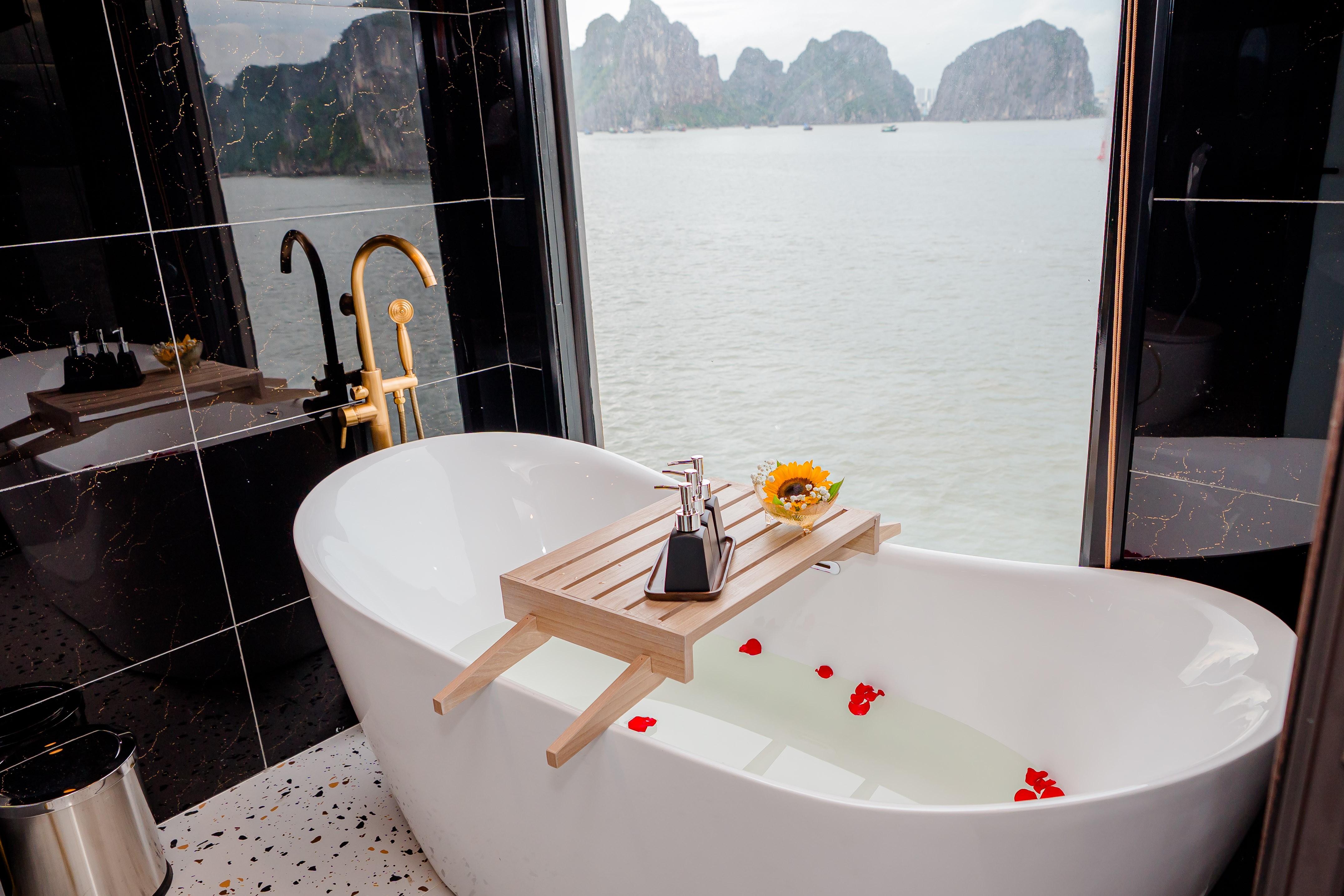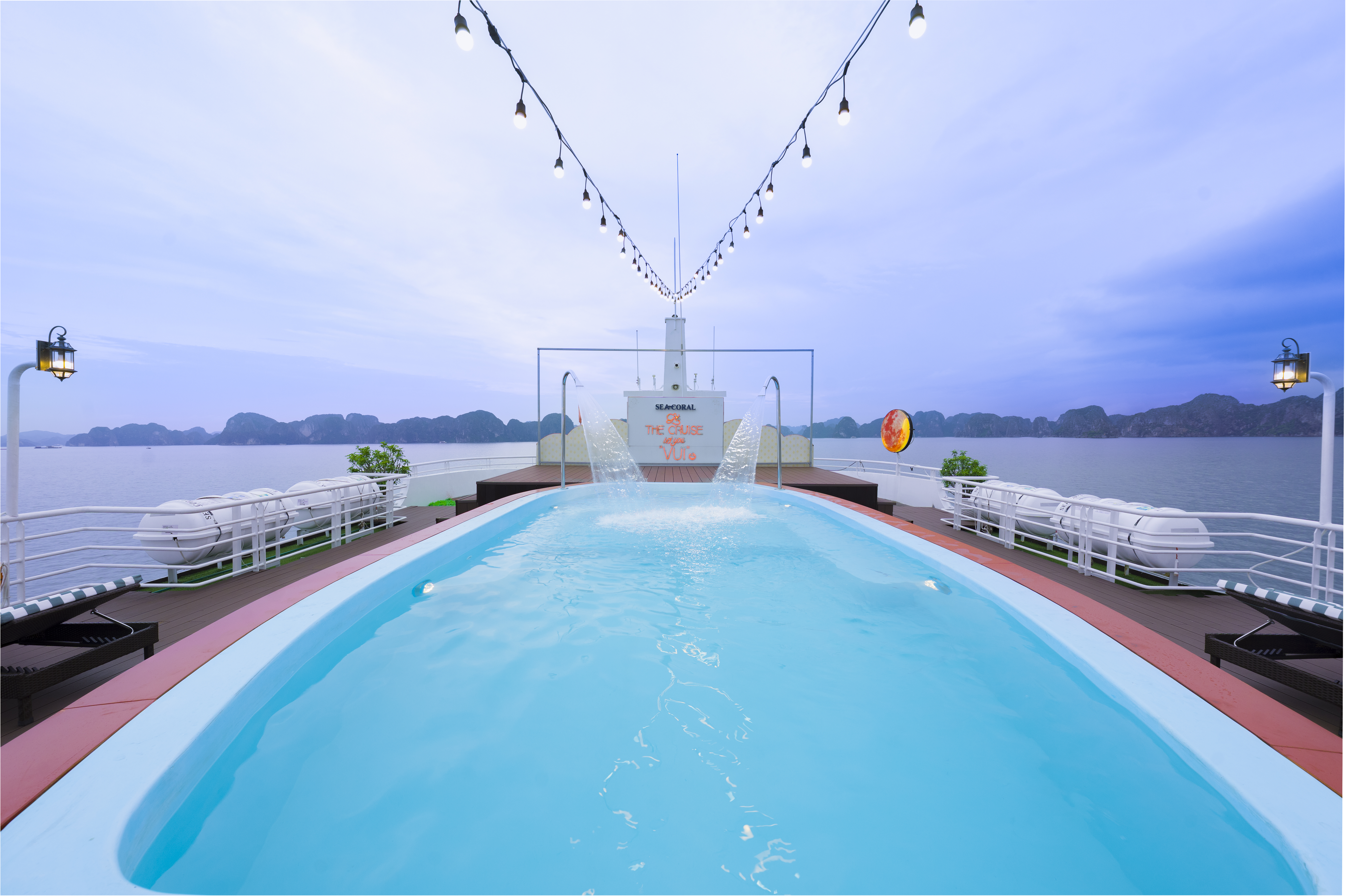 - Tầng thượng là không gian mở hoàn hảo để ngắm trọn vẻ đẹp Vịnh Lan Hạ, với sky bar, bể sục jacuzzi hình chiếc thuyền độc đáo, nơi du khách có thể thư giãn, ngâm mình và tận hưởng hoàng hôn hay bình minh cực kỳ chill.
