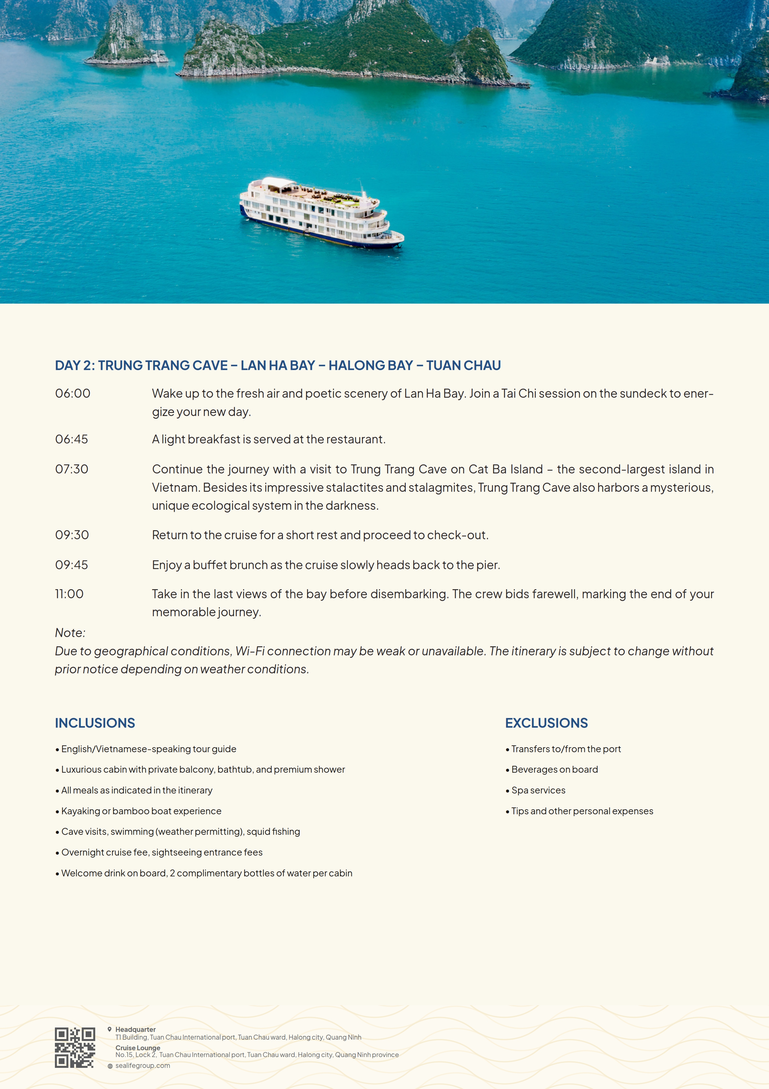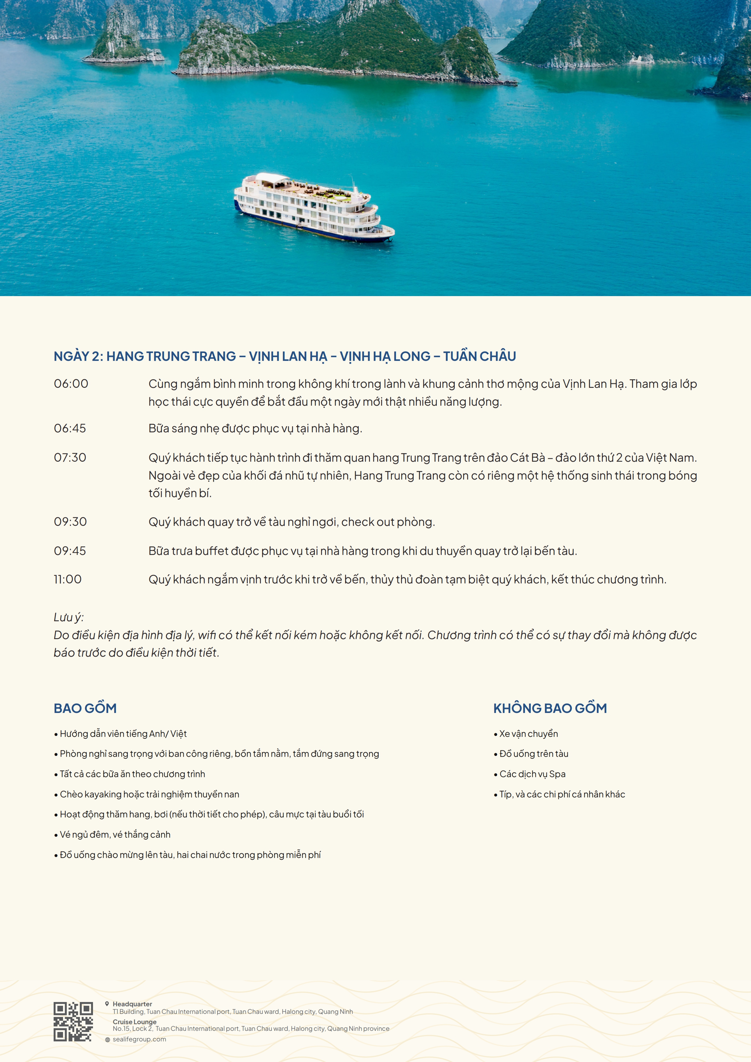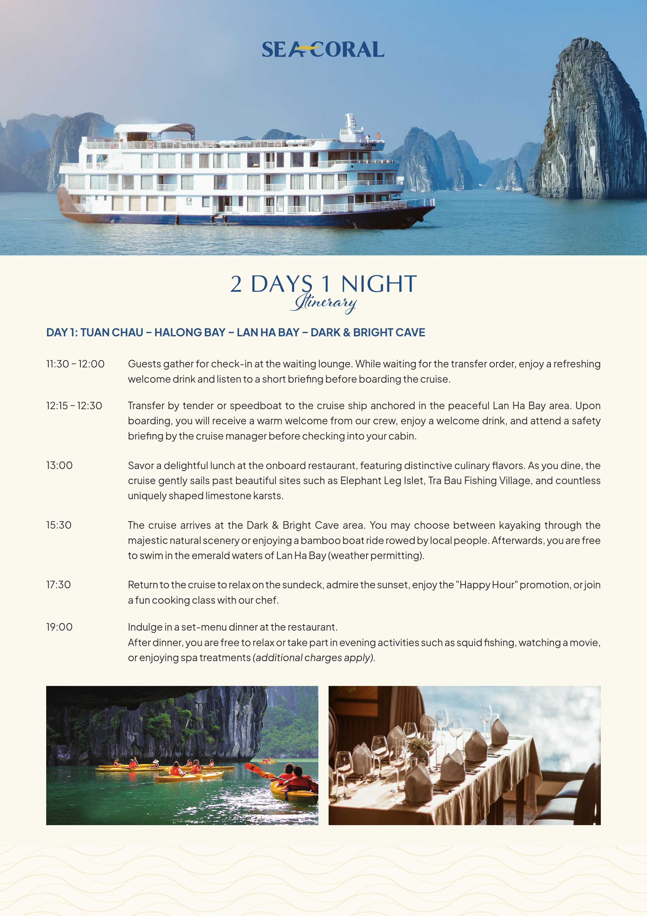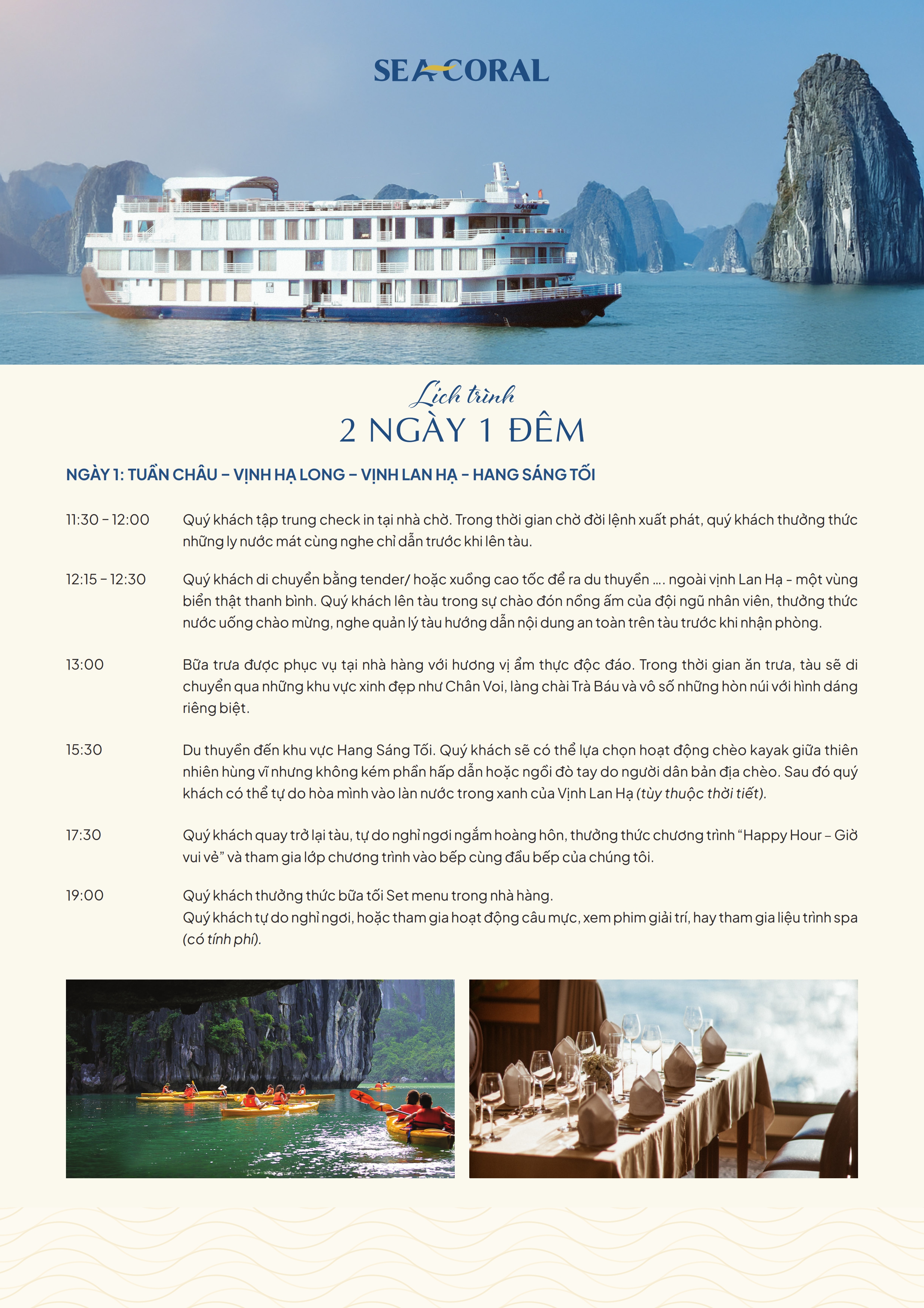 Trên du thuyền Sea Coral, mỗi hành trình là một cuộc phiêu lưu vừa thư giãn, vừa khám phá. Du khách có thể chèo kayak lướt trên mặt nước phẳng lặng, để tay chạm vào những khối thạch nhũ kỳ bí trong các hang động, hay nhẹ nhàng ngồi đò nan thưởng ngoạn cảnh đẹp yên bình. Mỗi khoảnh khắc đều đưa du khách gần hơn với vẻ đẹp nguyên sơ và kì diệu của thiên nhiên.