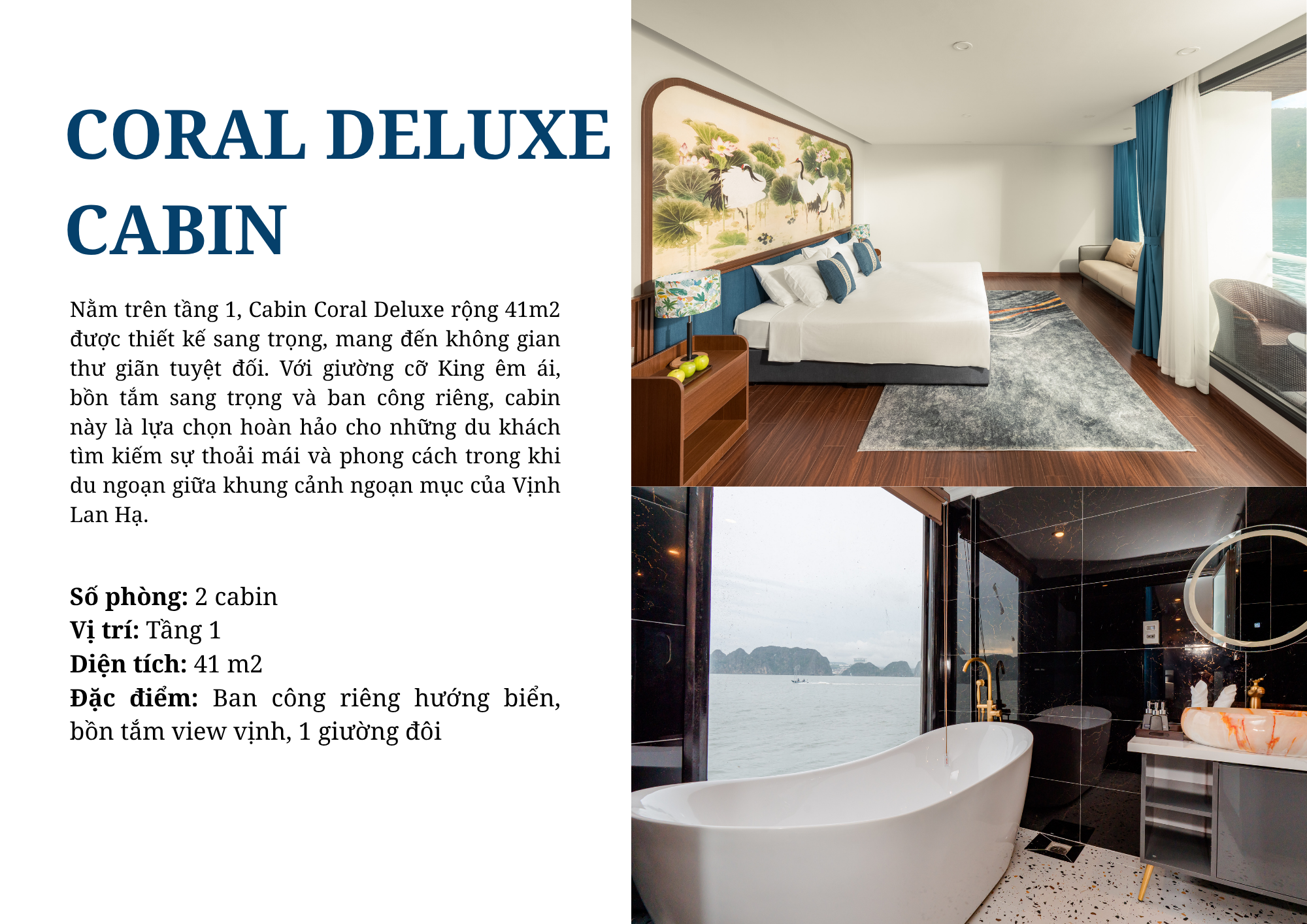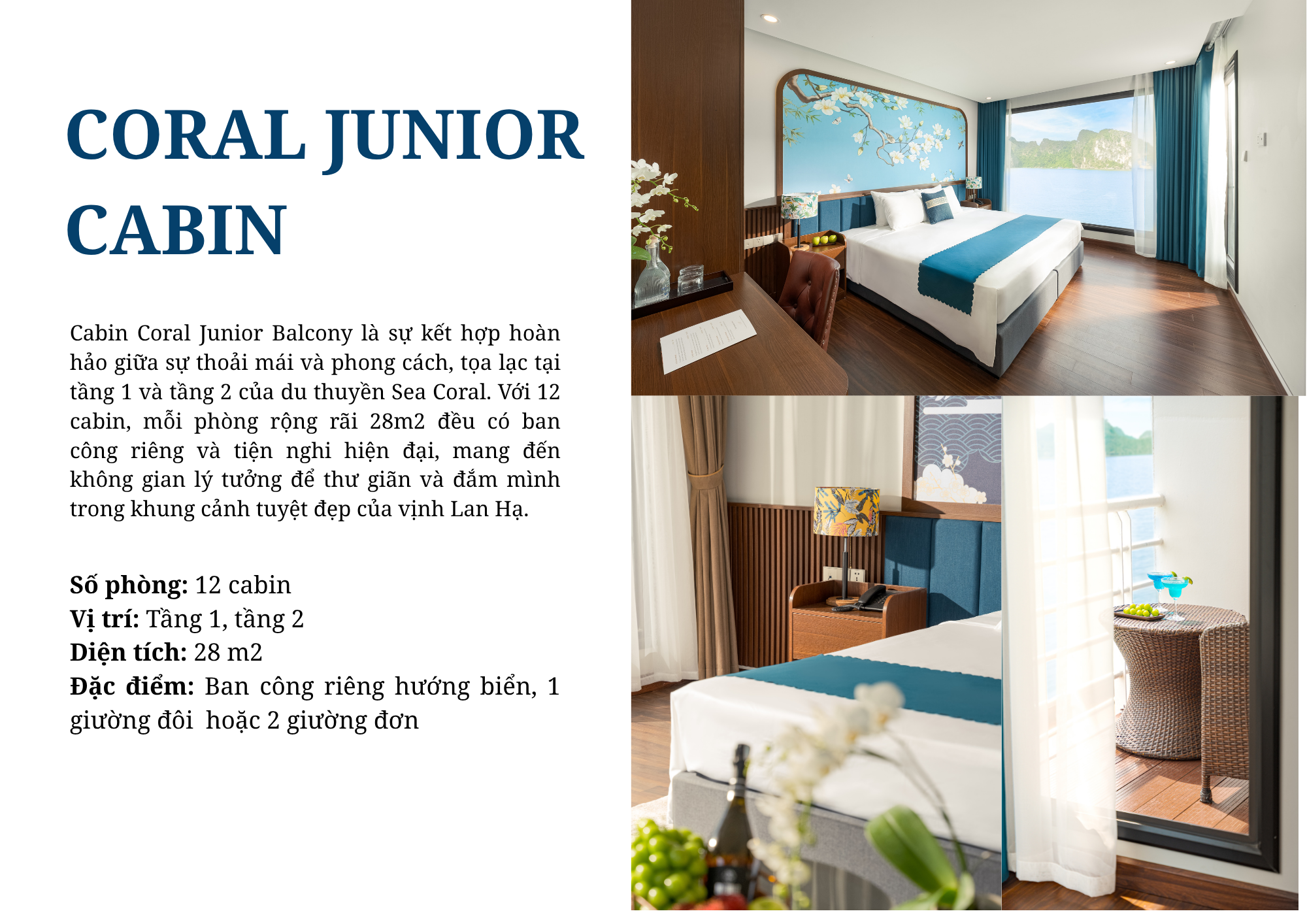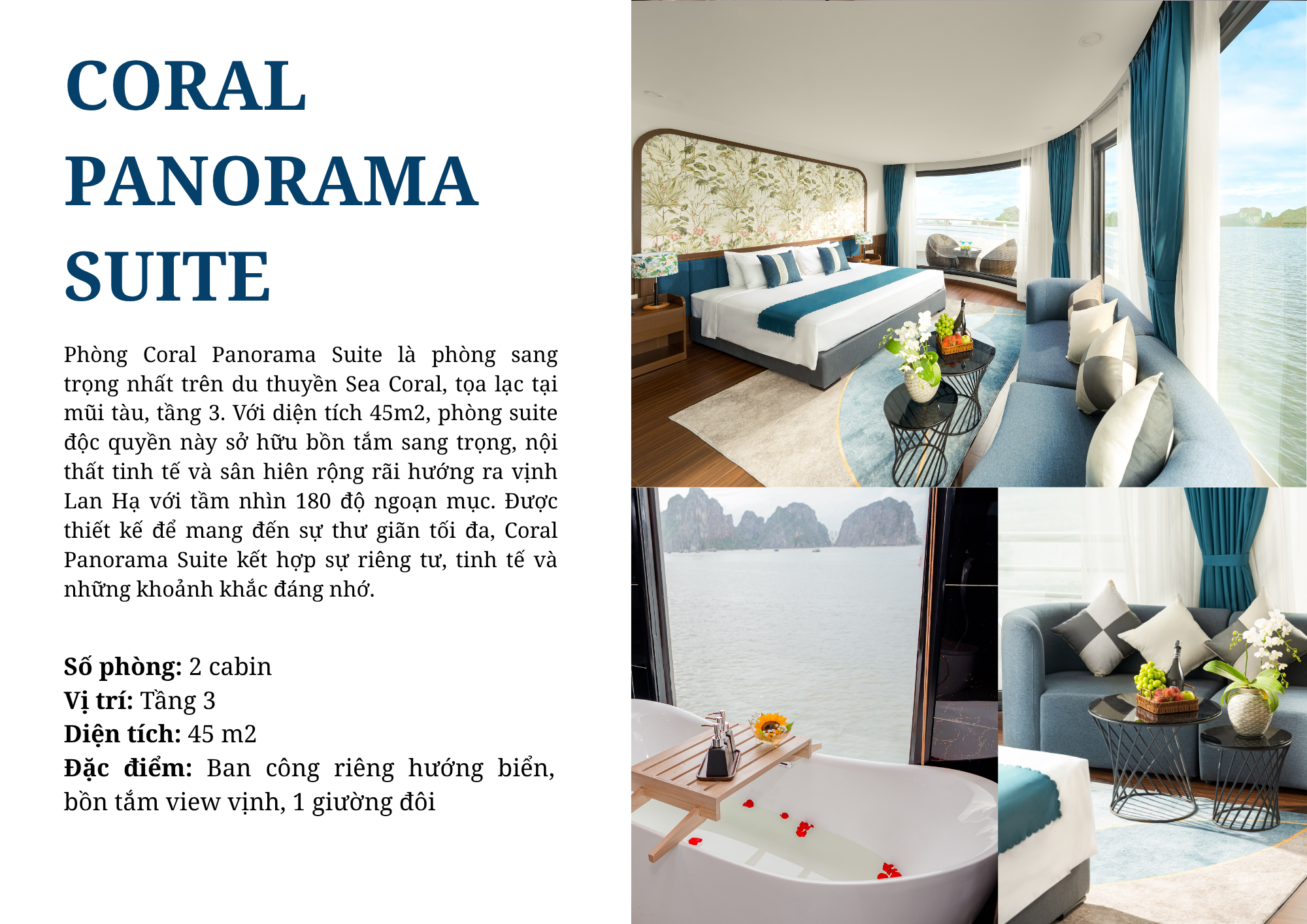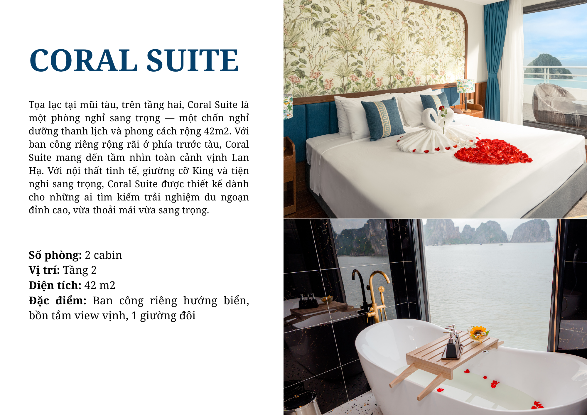 Lấy cảm hứng từ vẻ đẹp tinh tế và sức mạnh thầm lặng của những rặng san hô dưới đáy biển, du thuyền Sea Coral được ra mắt vào tháng 6 năm 2025, là hiện thân cho tinh thần hài hòa và kiên cường vượt thời gian. Giữa khung cảnh thiên hiên thơ mộng của Thiên đườn bị lãng quên - Vịnh Lan Hạ, du thuyền Sea Coral lướt nhẹ như một viên ngọc quý giữ biển trời, mời gọi du khách trải nghiêhn hành trình nghỉ dưỡng tinh tế và yên bình.