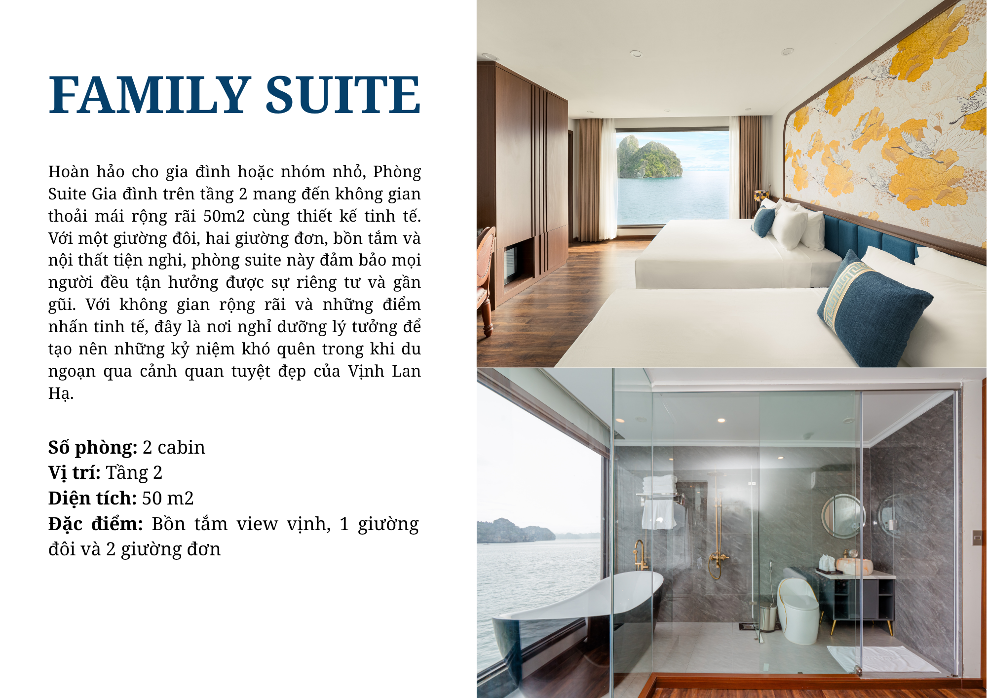 - Tầng 1 và tầng 2 là khu vực phòng nghỉ, tất cả các phòng đều có ban công hướng biển, du khách có thể chiêm ngưỡng vẻ đẹp tuyệt mỹ của vịnh kì quan mọi thời điểm trong ngày. Các phòng được thiết kế đa dạng, phù hợp với mọi đối tượng khách hàng, từ cặp đôi, gia đình đến nhóm bạn.