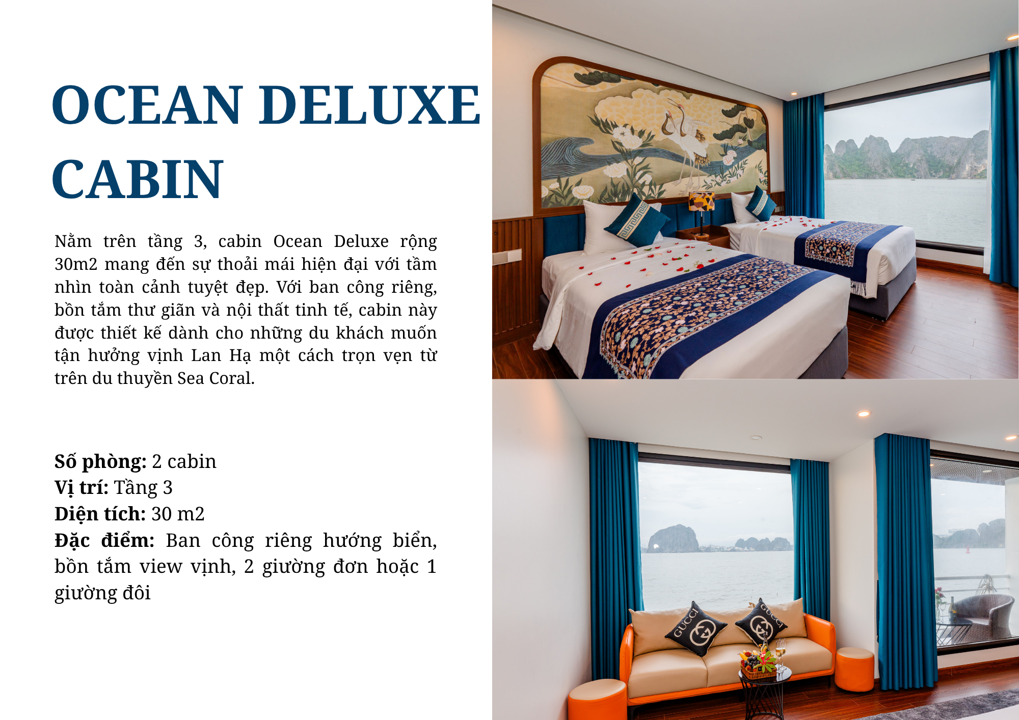 Với chiều dài 63,5m, rộng 12m, du thuyền Sea Coral gồm có 4 tầng với 22 cabin phòng nghỉ cao cấp, đủ sức phục vụ 60 khách lưu trú qua đêm và lên tới 160 khách tham quan trong ngày. Đội ngũ 28 thủy thủ chuyên nghiệp luôn sẵn sàng phục vụ, đảm bảo hành trình an toàn và thoải mái cho du khách.