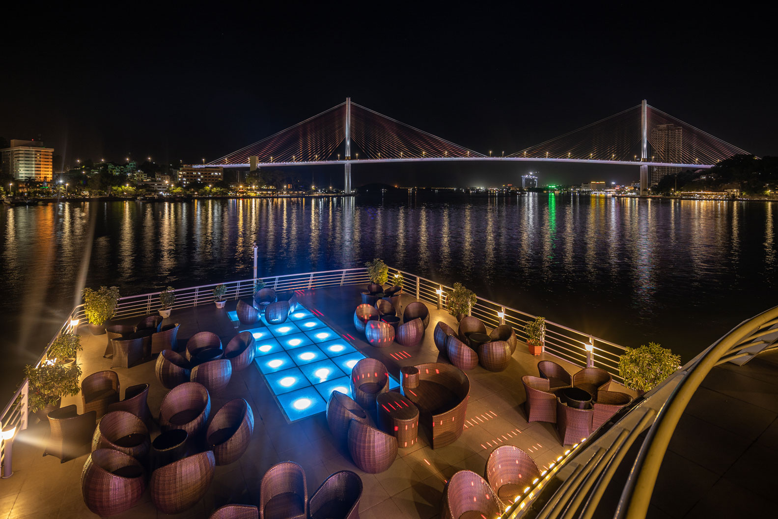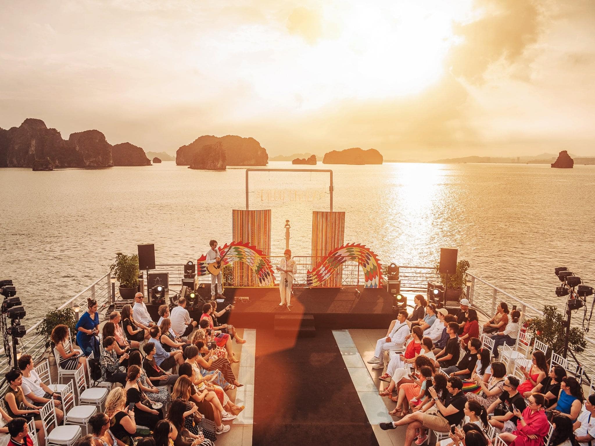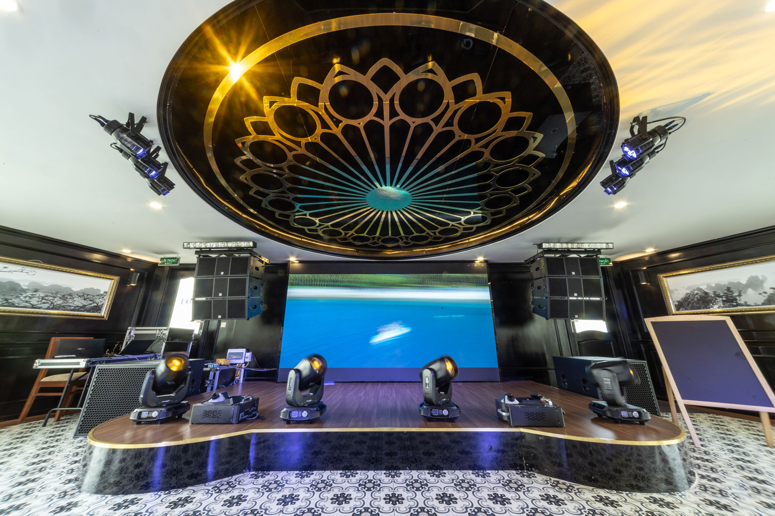 - Không gian trong nhà và ngoài trời lên đến 350m2 tọa lạc tại tầng 3 của du thuyền với các thiết bị âm thanh ánh sáng tiên tiến bậc nhất, sự lựa chọn hoàn hảo cho những bữa tiệc âm nhạc sôi động hay thưởng thức những giai điệu du dương, êm đềm.