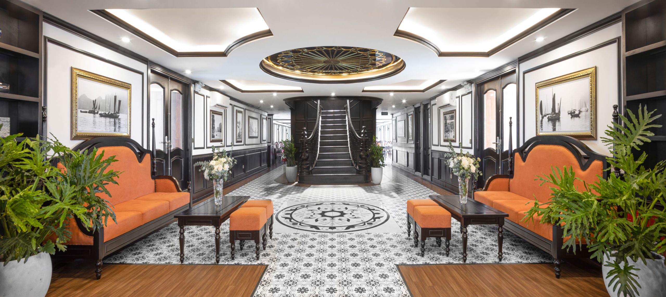- Khu vực tiếp đón với không gian lên đến 200m2 cùng nội thất tân cổ điển quý phái, đem đến cho mỗi khách hàng những trải nghiệm sang trọng ngay từ những bước đi đầu tiên lên du thuyền.