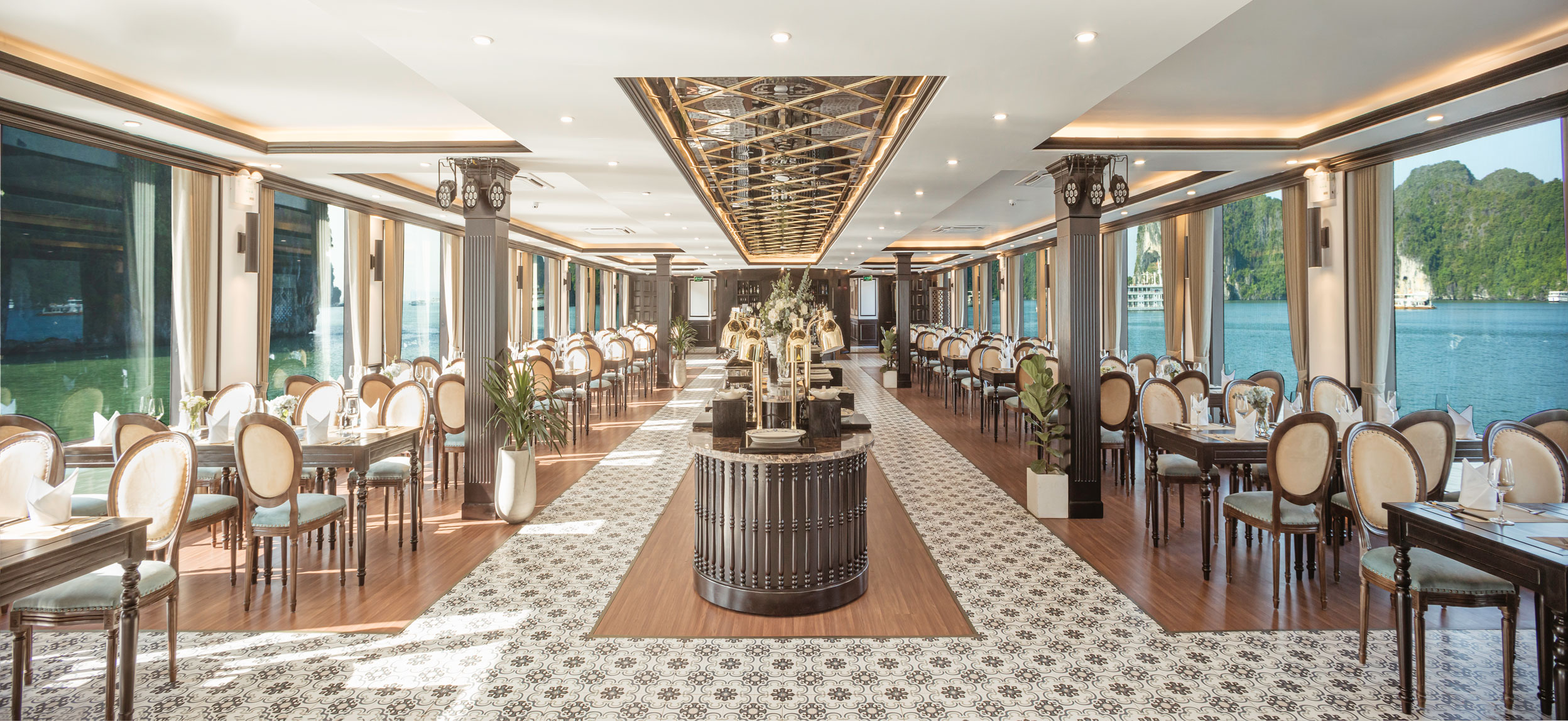 - Nhà hàng Sea Breeze với diện tích 350m2 phục vụ tới 200 khách với không gian được thiết kế phù hợp cho cả ăn set hoặc buffet, nằm tại vị trí tầng 1 của du thuyền.