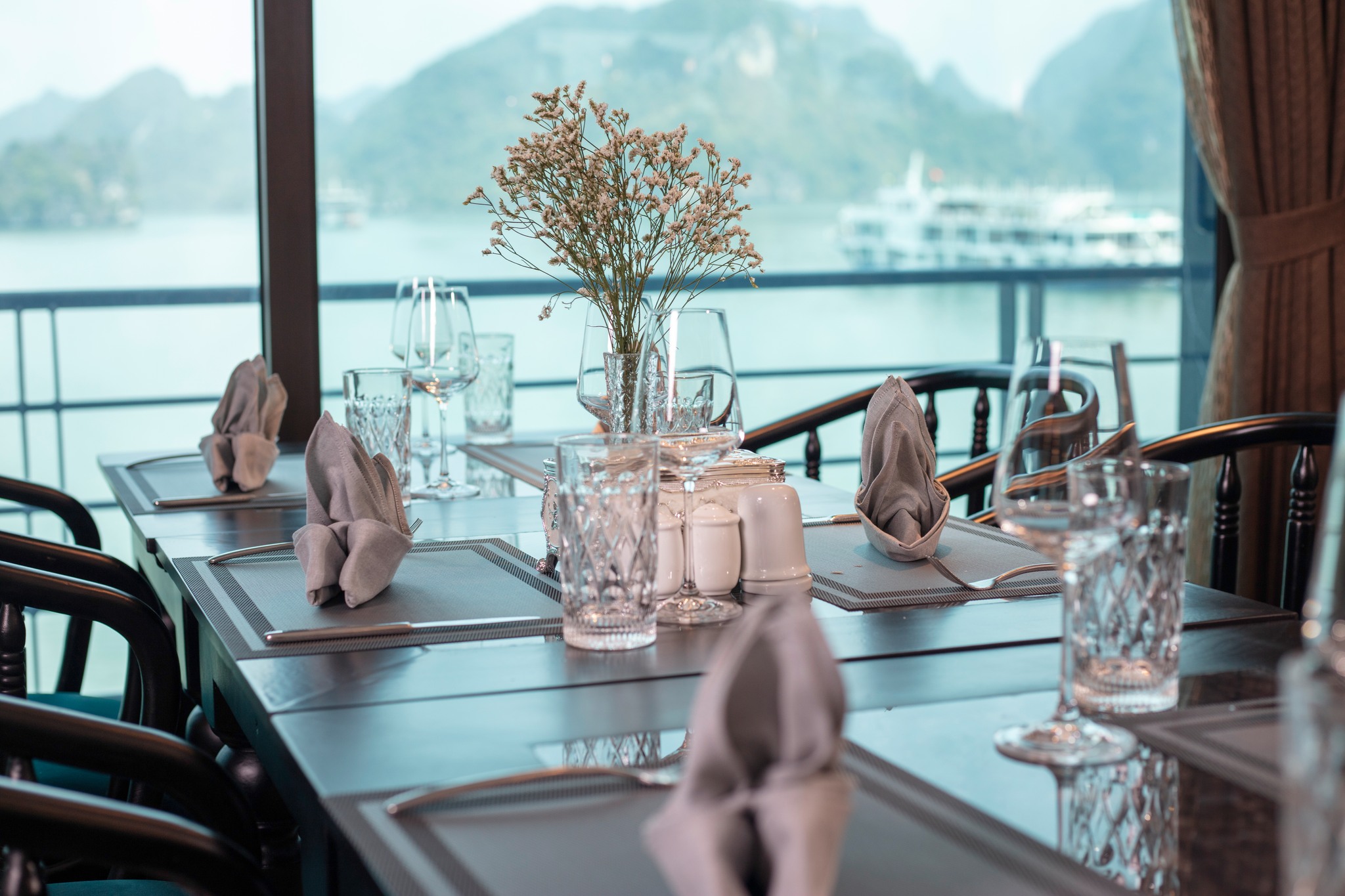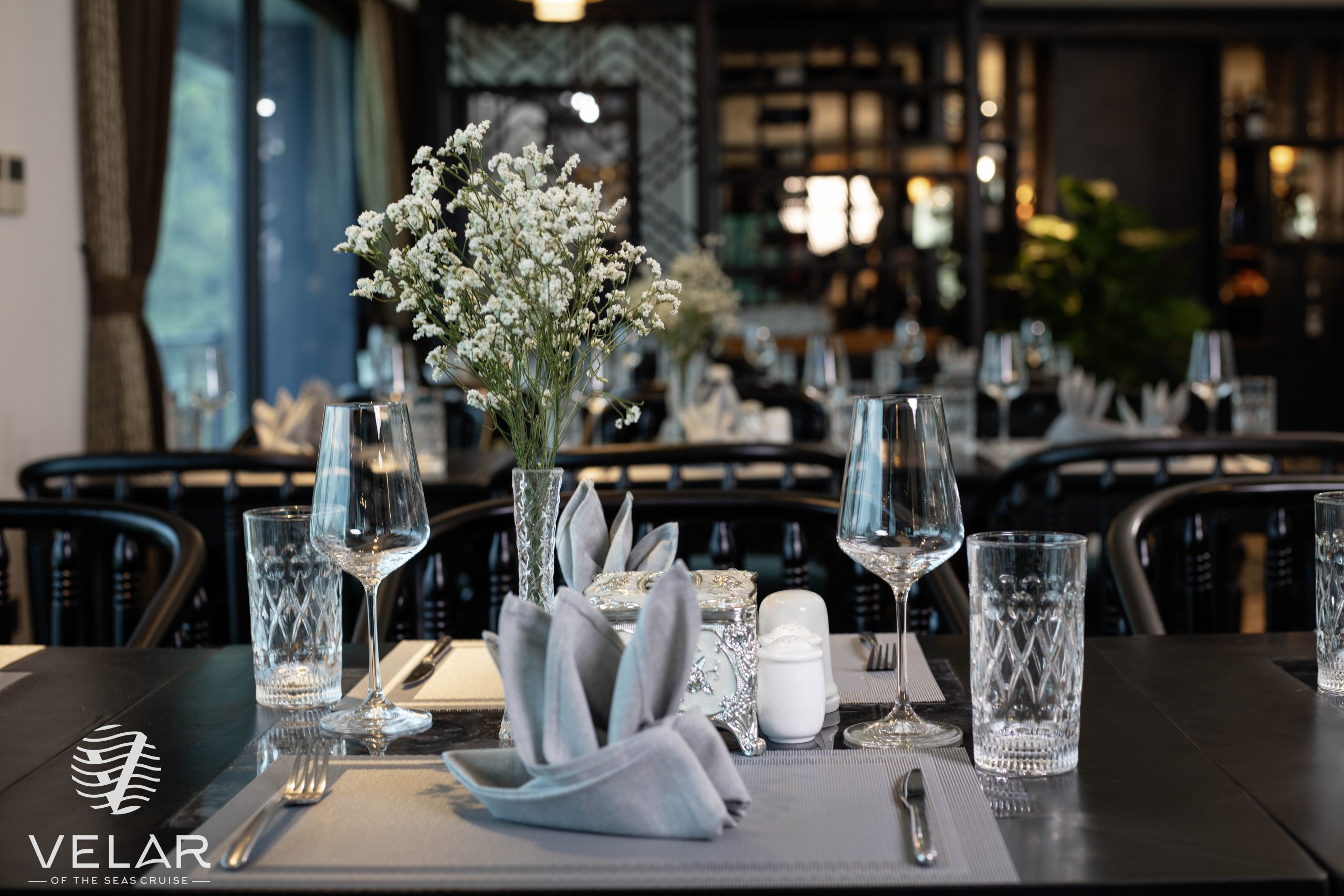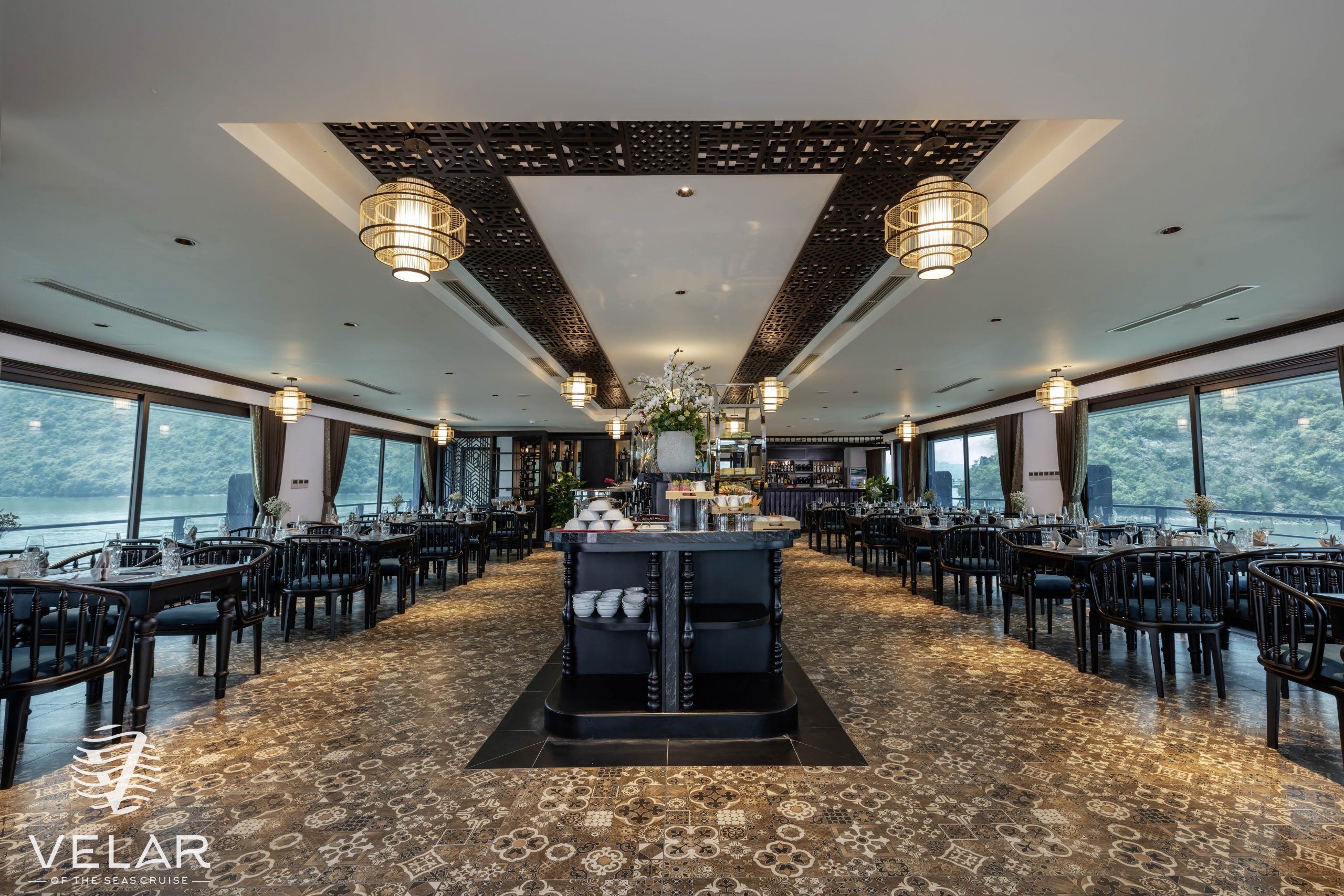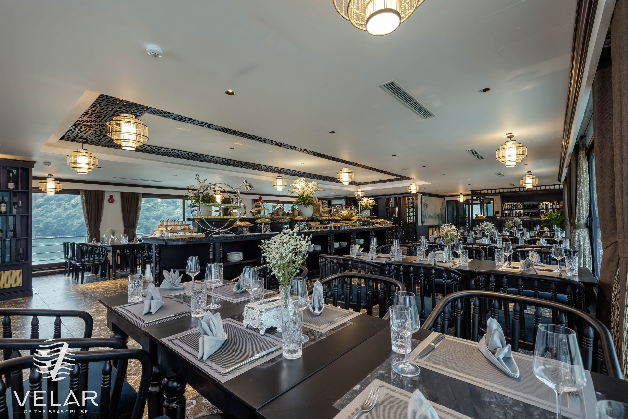 Với sức chứa lên tới 80 người, Nhà hàng tại Velar Cruise là nơi tuyệt vời để quý khách khám phá hương vị ẩm thực tinh tế, kết hợp hài hoà, đa dạng trải nghiệm từ Âu đến Á, được gửi gắm trong đó sự sáng tạo và phục vụ chuyên nghiệp.