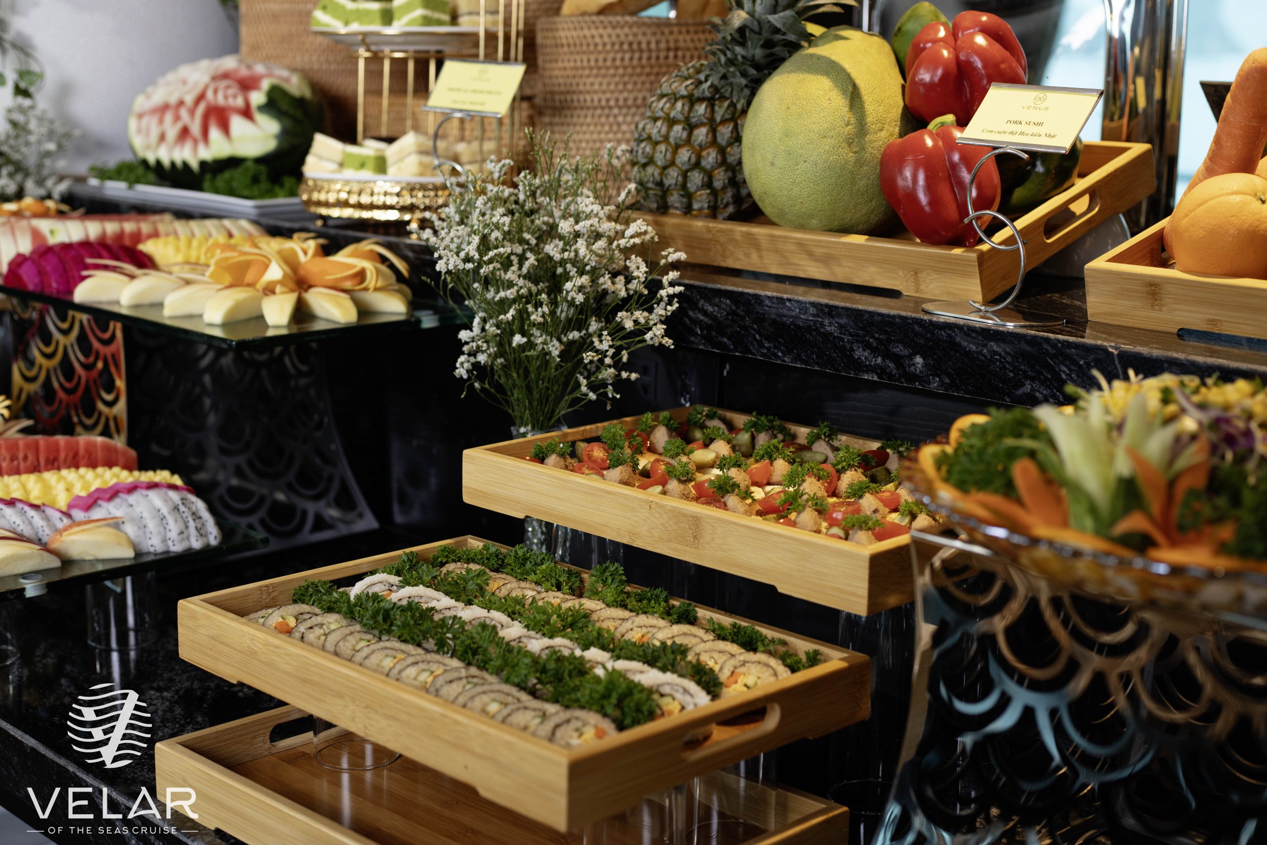 Đến với du thuyền Velar of the seas, ăn uống không đơn giản chỉ là một bữa ăn, mà là một hành ẩm thực đầy hấp dẫn, du khách sẽ trải nghiệm từng cung bậc cảm xúc qua các món ăn đặc sắc mà du thuyền mang lại, được chế biến cầu kì bởi các đầu bếp 5* trứ danh của Velar of the seas.