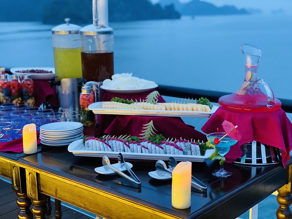 Đặc biệt, du khách sẽ không thể quên bữa tiệc hoàng hôn trên boong tàu khi mặt trời dần lặn xuống, bầu trời chuyển sắc cam vàng và tiếng sóng biển dịu dàng vỗ về. Du khách sẽ được tận hưởng khoảng thời gian thư giãn nhâm nhi đồ uống cùng snack và trái cây tươi trên sundeck do du thuyền Vera chuẩn bị, hoặc đắm mình trong bể sục jacuzzi giữa không gian thiên nhiên tuyệt vời, ngắm hoàng hôn buông xuống thật dịu dàng và yên bình. Đó là giây phút du khách thực sự cảm nhận được vẻ đẹp tuyệt mỹ của di sản thiên nhiên thế giới.